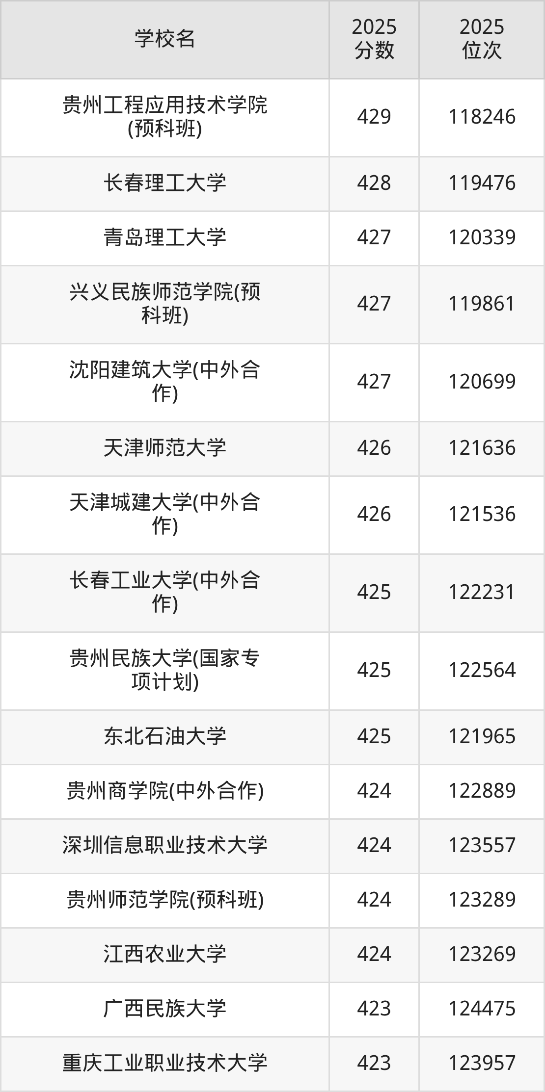 温馨提示:全国各省录取分数线不相同,本文以贵州省为例,为大家带来2025年录取分数线位于420到460分的公办本科大学名单汇总,并附上该分数段对应的位次排名区间,供查阅。