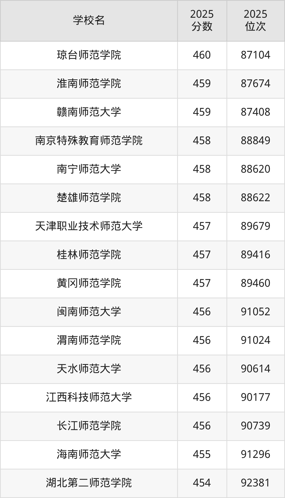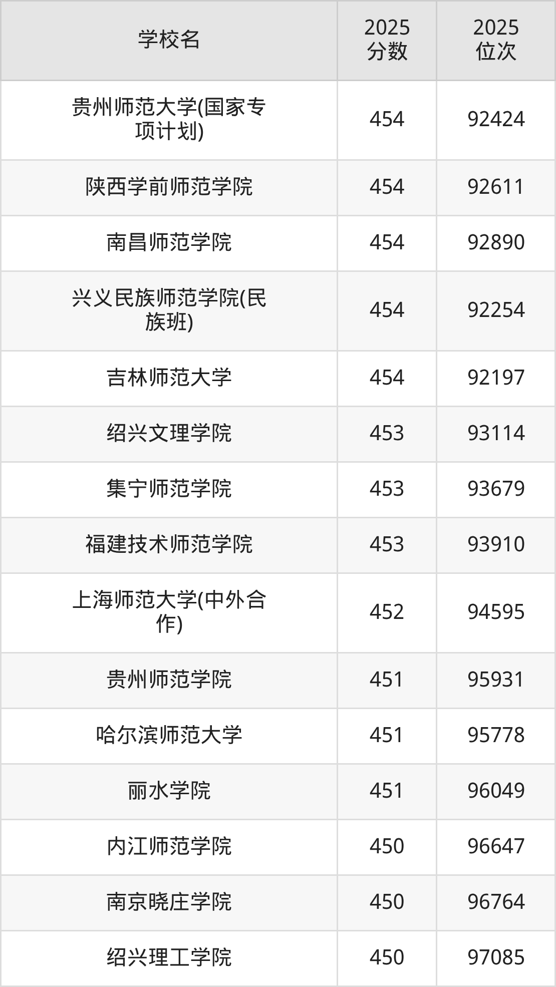 温馨提示:全国各省录取分数线不相同,本文以贵州省为例,为大家带来2025年录取分数线位于450到500分的师范大学名单汇总,并附上该分数段对应的位次排名区间,供查阅。