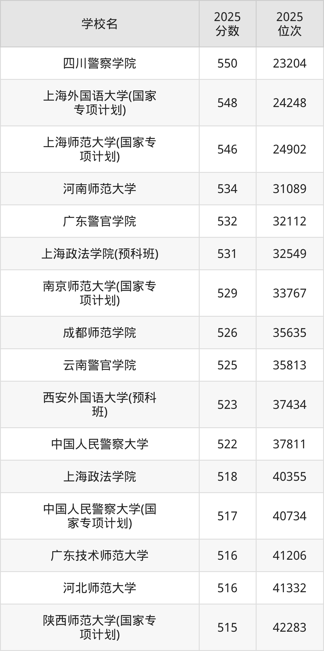 物理类500到550分的大学中分数对应位次最高的是四川警察学院,2025年最低分550分,对应最低位次是23204名;分数对应位次最低的是湖北警官学院,2025年最低分500分,对应最低位次是52111名。