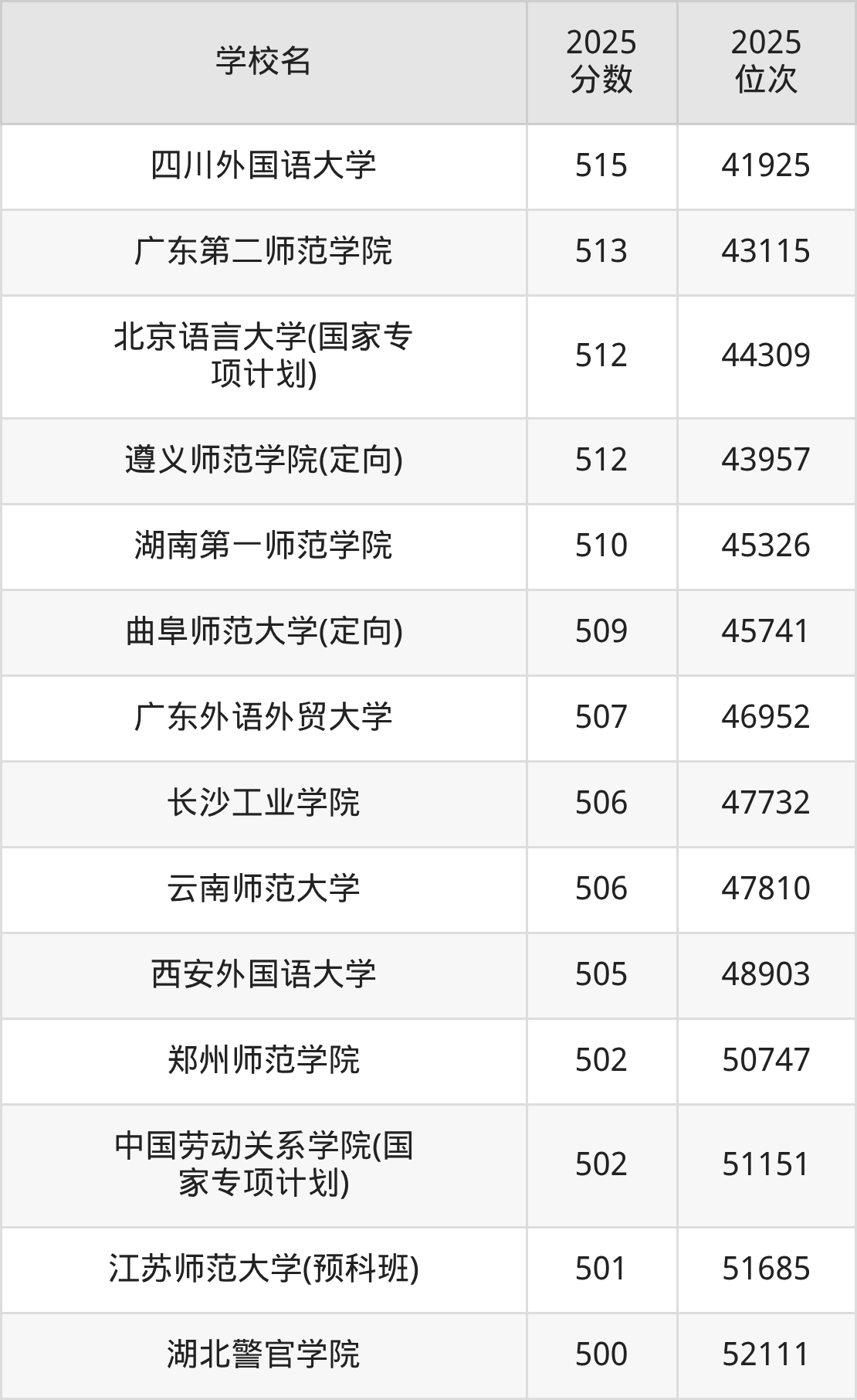 对于首选物理的同学来说,500到550分能上的文科大学中比较好的有广东外语外贸大学(507分)、河南师范大学(534分)、河北师范大学(516分)、云南师范大学(506分)、上海政法学院(518分)等,这些大学均位居全国300强以内。