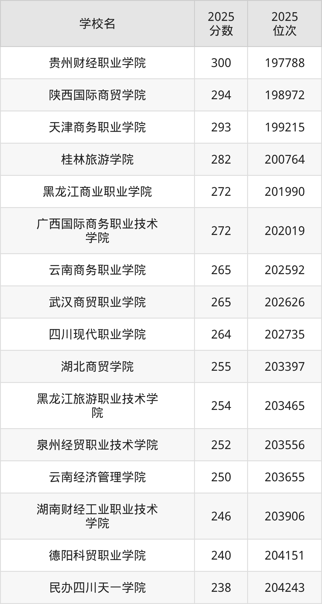 温馨提示:全国各省录取分数线不相同,本文以贵州省为例,为大家带来2025年录取分数线位于200到300分的财经大学名单汇总,并附上该分数段对应的位次排名区间,供查阅。