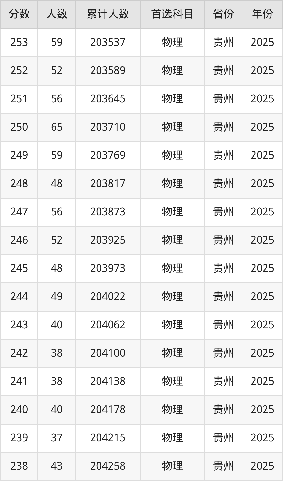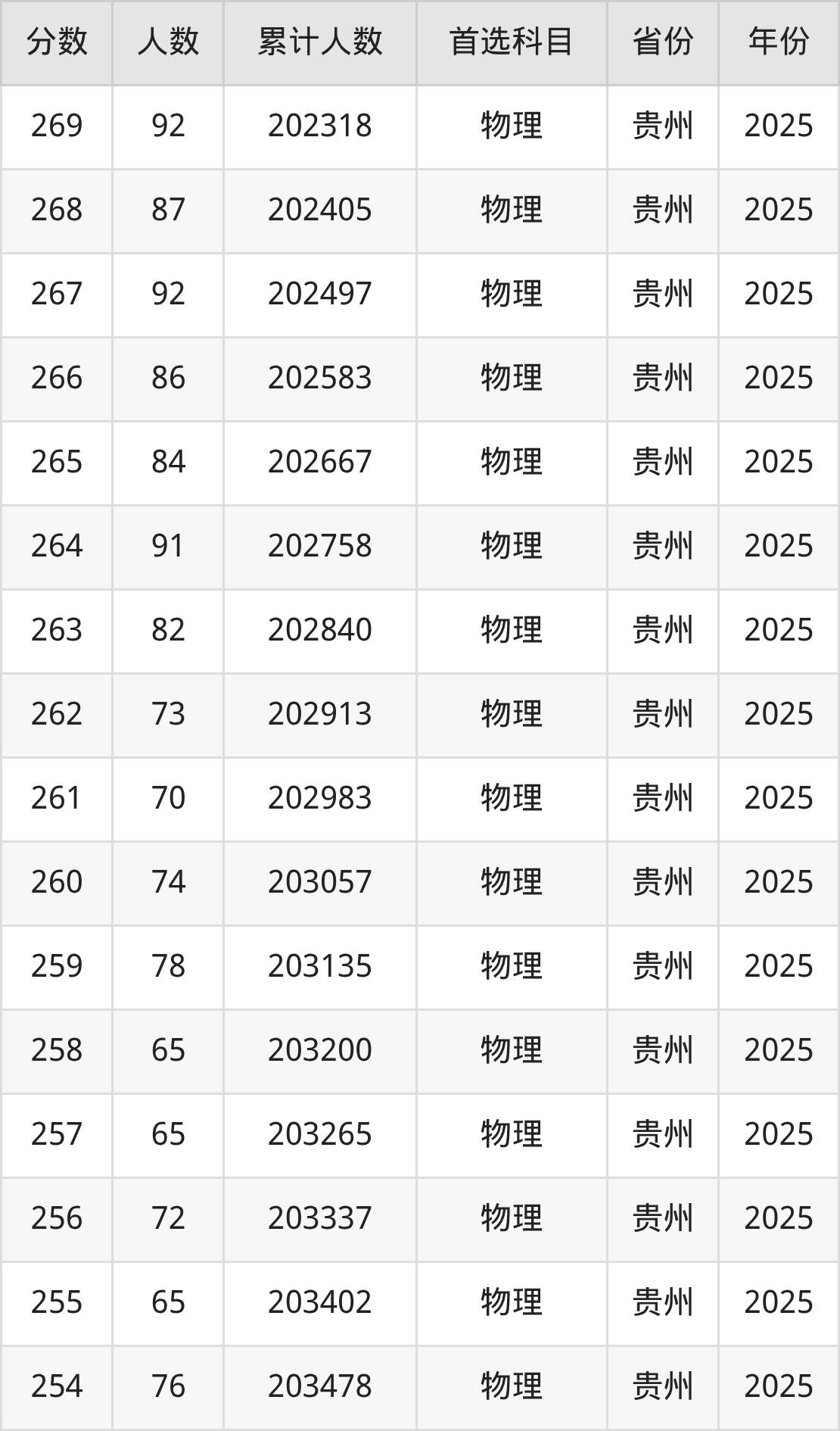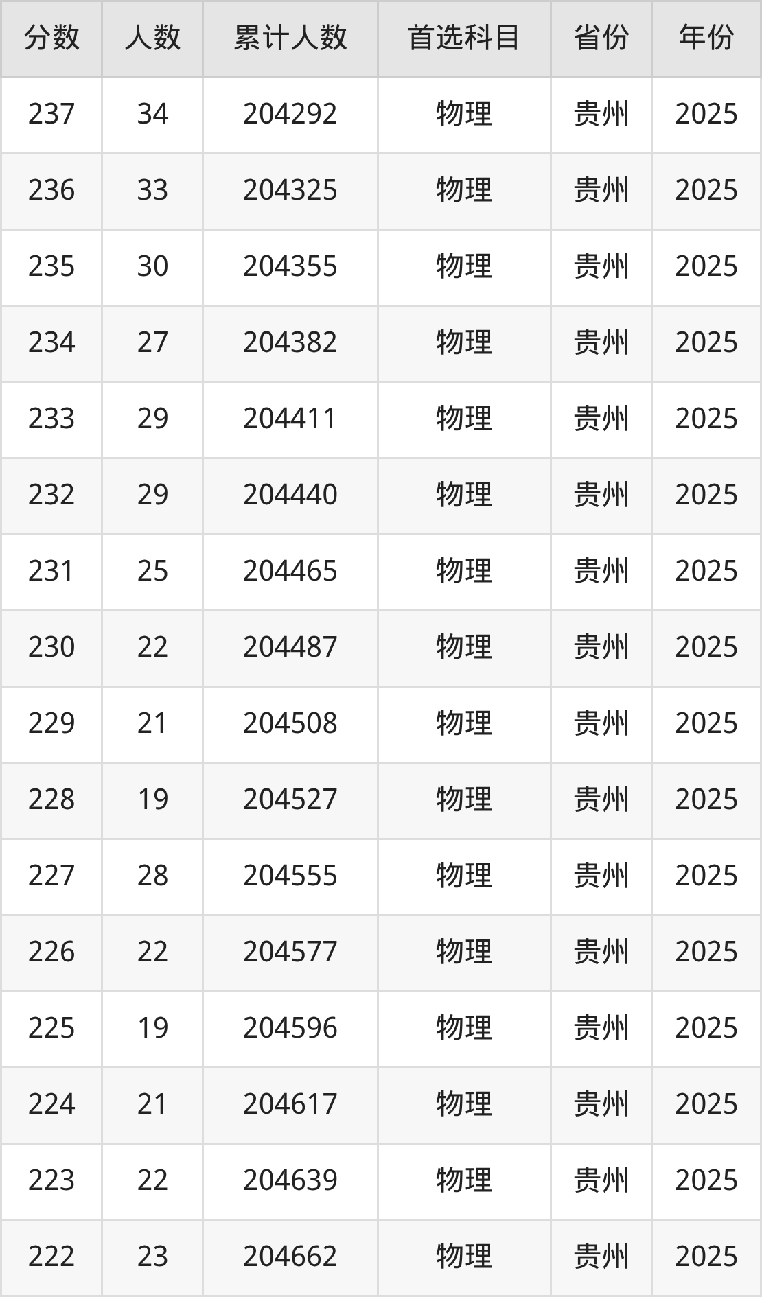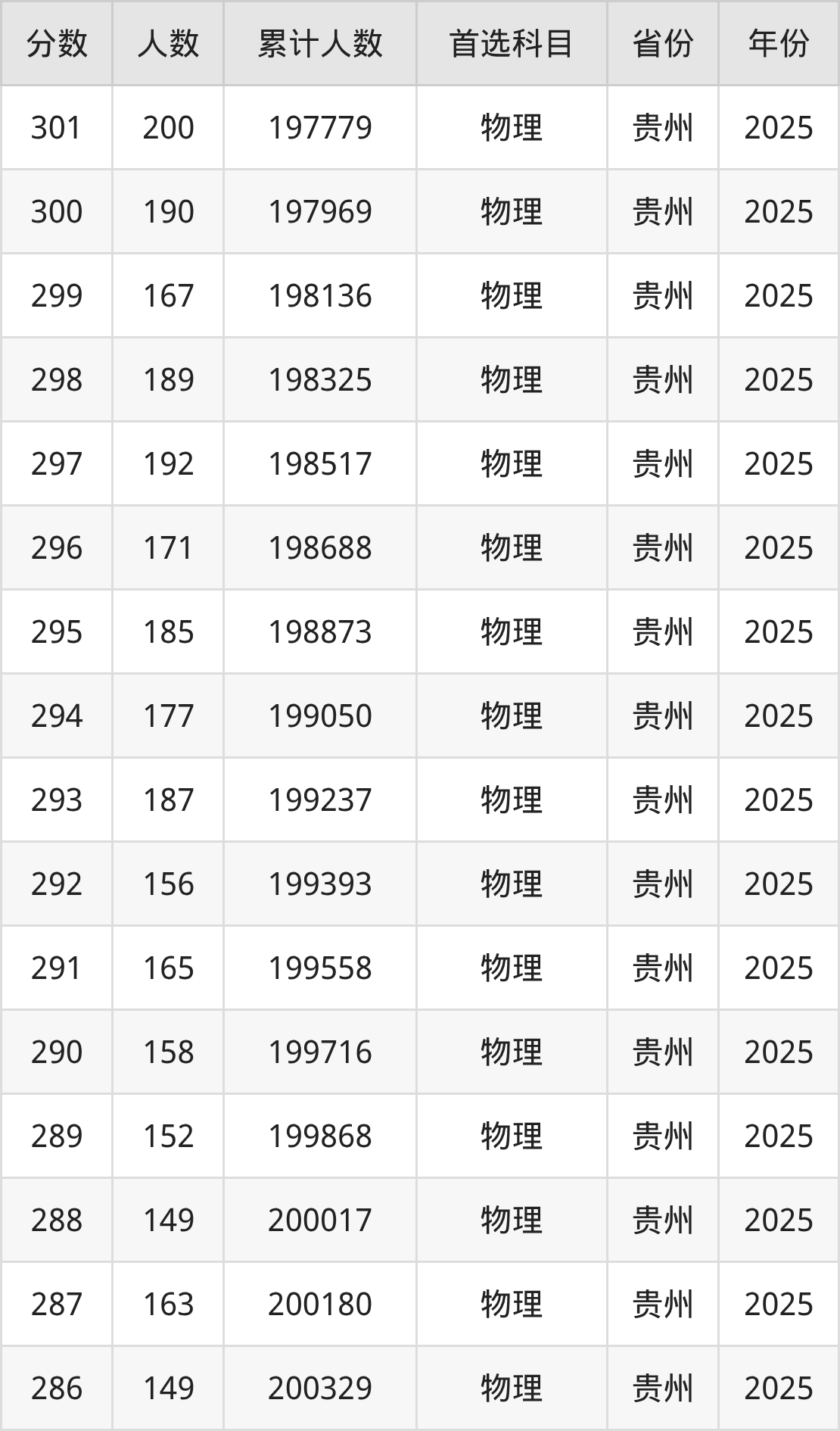物理类200到300分的位次排名:197780名~204907名