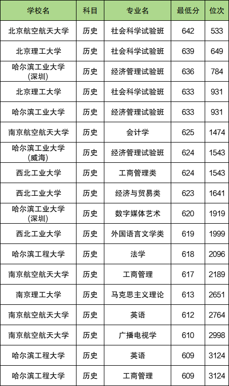 2024年河北高考国防七子历史类专业分最高的院校是北京航空航天大学642分,对应专业是社会科学试验班;专业分较低的院校是哈尔滨工程大学609分,对应专业是工商管理
