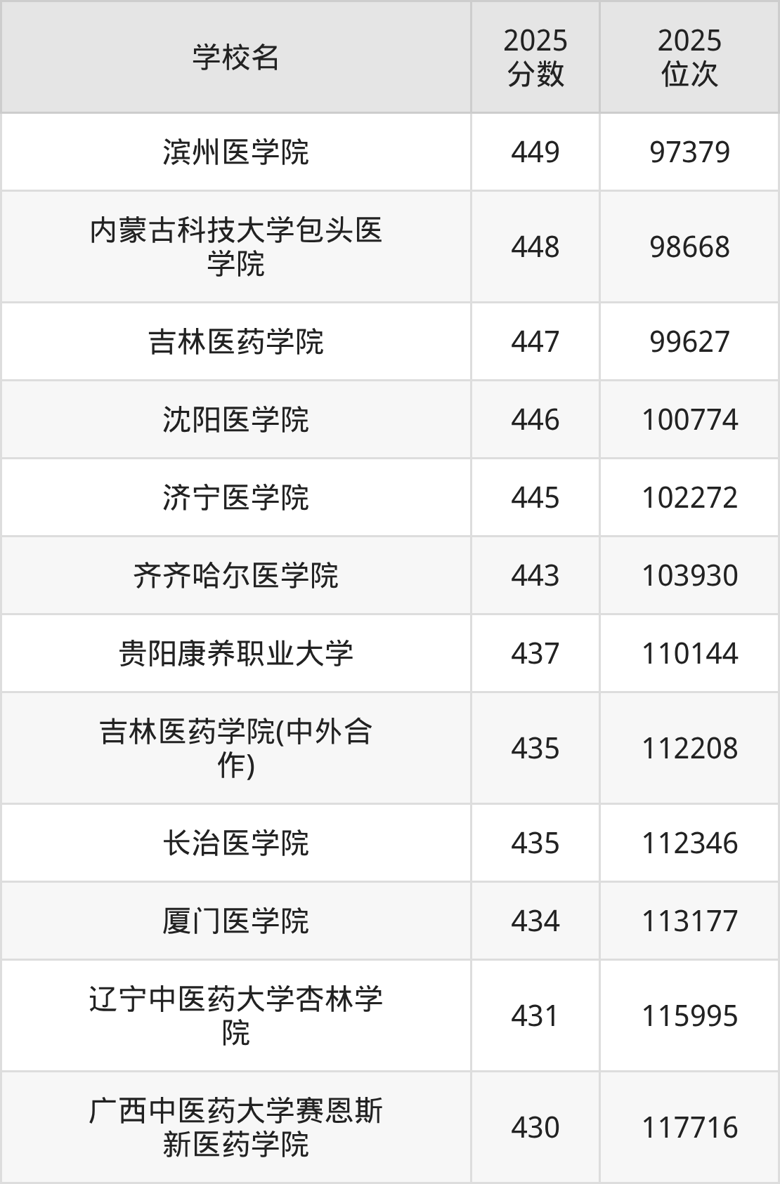 物理类430到450分的大学中分数对应位次最高的是滨州医学院,2025年最低分449分,对应最低位次是97379名;分数对应位次最低的是广西中医药大学赛恩斯新医药学院,2025年最低分430分,对应最低位次是117716名。