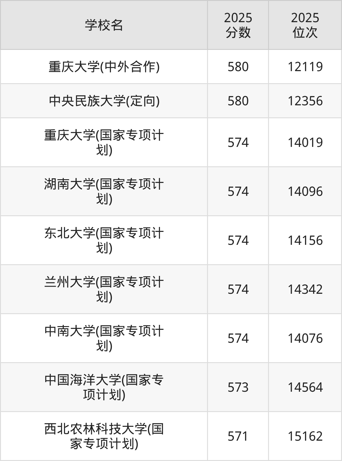 物理类570到580分的大学中分数对应位次最高的是重庆大学(中外合作),2025年最低分580分,对应最低位次是12119名;分数对应位次最低的是西北农林科技大学(国家专项计划),2025年最低分571分,对应最低位次是15162名。