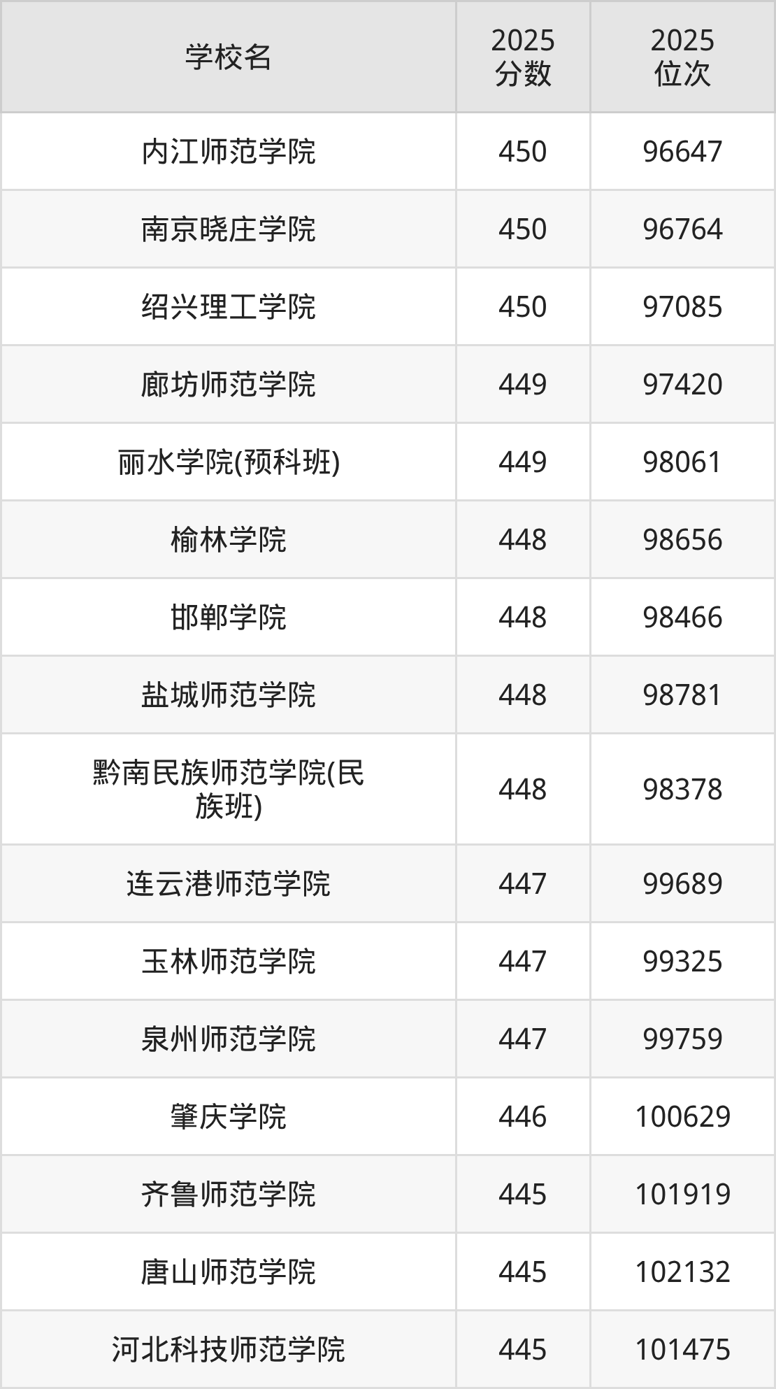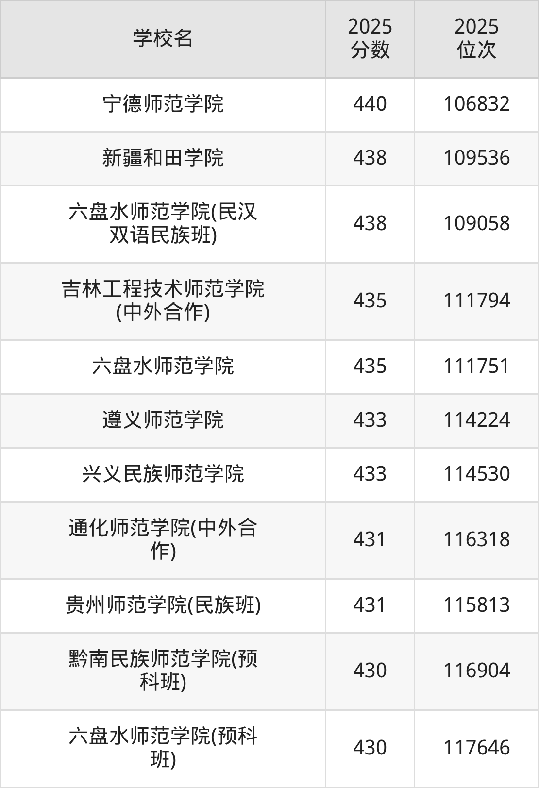 温馨提示:全国各省录取分数线不相同,本文以贵州省为例,为大家带来2025年录取分数线位于430到450分的二本师范大学名单汇总,并附上该分数段对应的位次排名区间,供查阅。