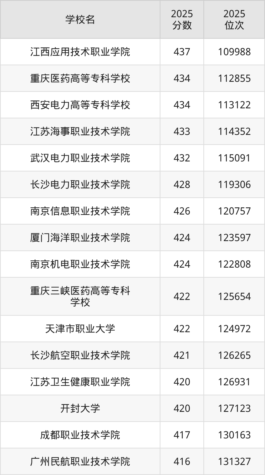 对于首选物理的同学来说,410到450分能上的公办专科学校中比较好的有天津市职业大学(422分)、成都职业技术学院(417分),这些大学均位居全国60强以内。