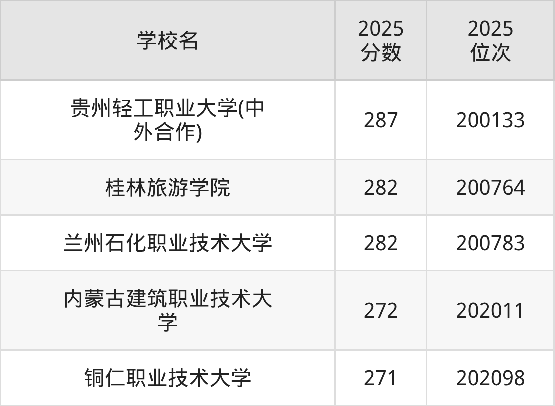 录取分数线的波动较大,下面圆梦小编为大家带来了2025年260到300分对应的位次排名区间,建议2026年位于该位次范围内的考生参考上文所整理的学校(本文仅针对贵州省)。
