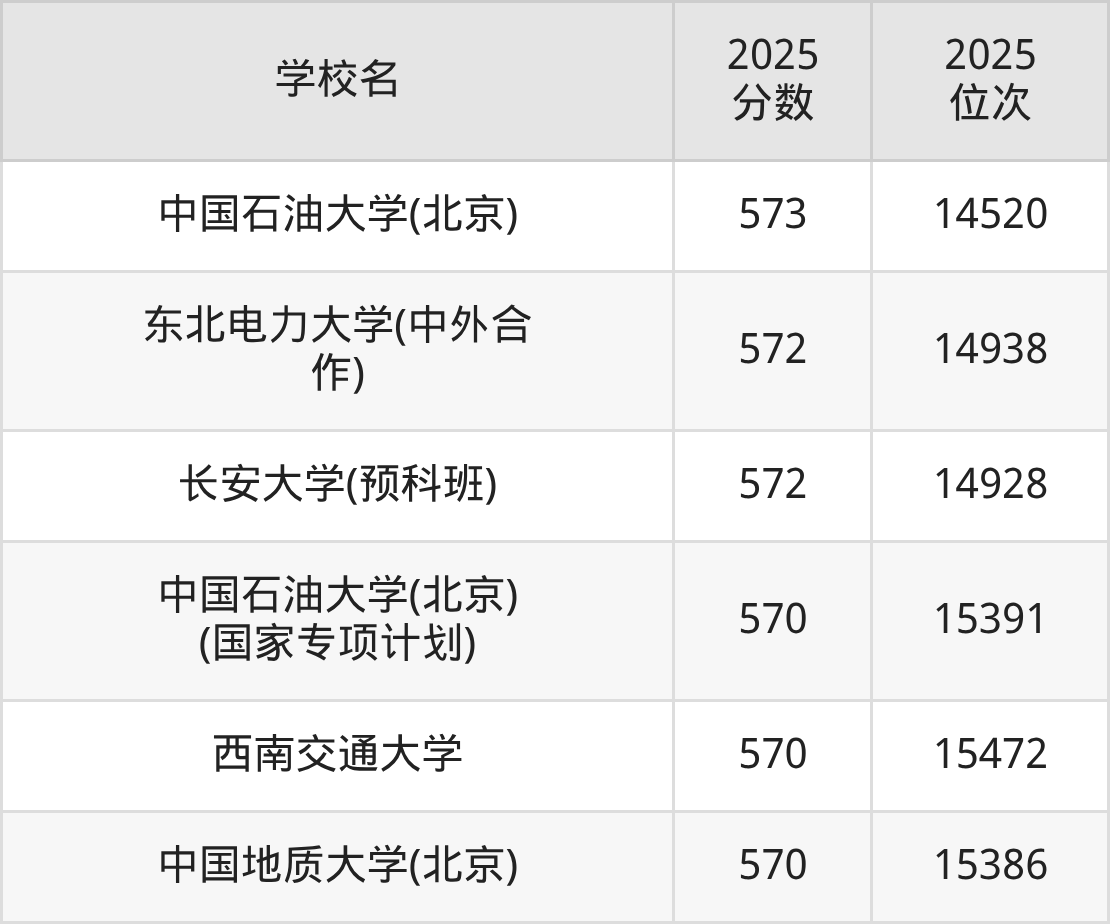物理类570到600分的大学中分数对应位次最高的是华东理工大学,2025年最低分599分,对应最低位次是7191名;分数对应位次最低的是中国石油大学(北京)(国家专项计划),2025年最低分570分,对应最低位次是15391名。
