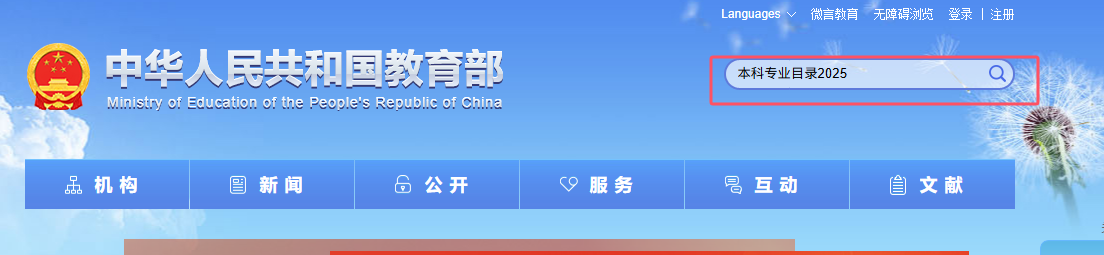 第一步:同学们先进入教育部官网,在首页右上方的搜索框中输入“本科专业目录+最新一年年份”,然后点击查询的按钮。