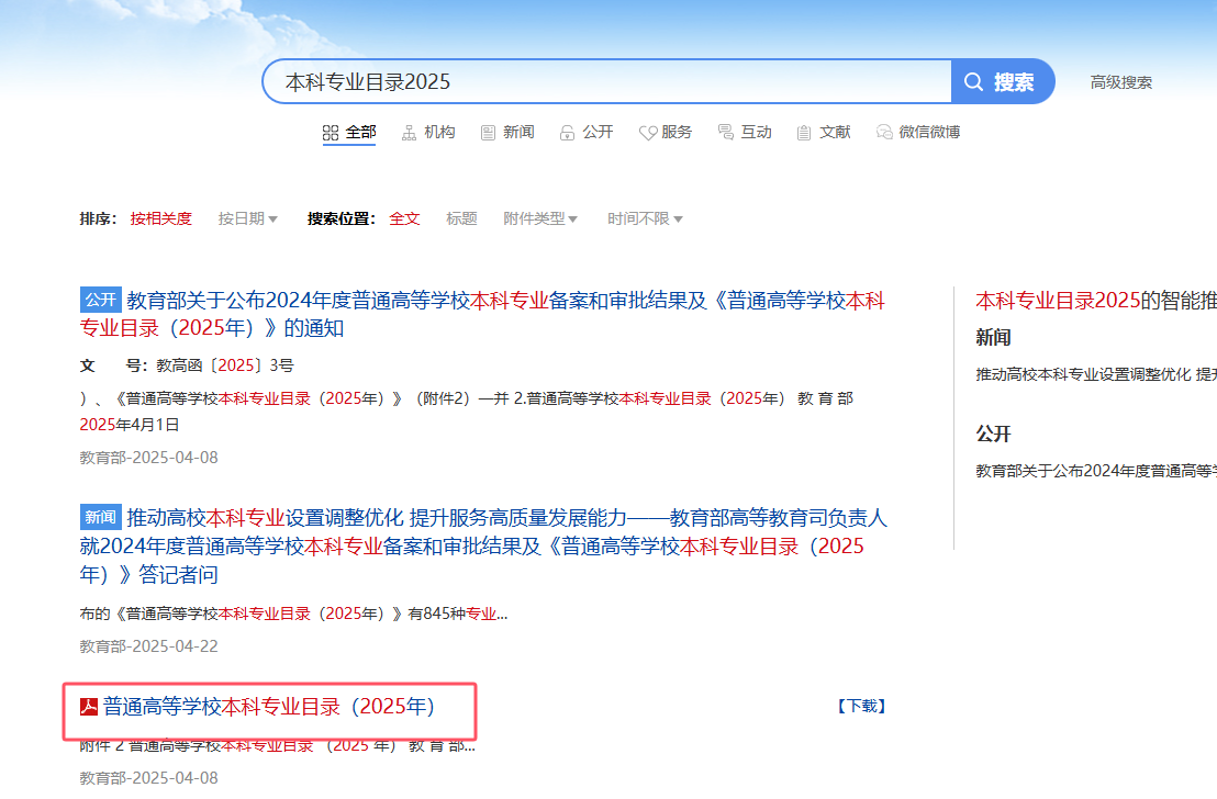 第三步:待搜索结果出来后,选择第三项“普通高等学校本科专业目录”,即可查询2025年高考本科专业的专业代码,也可以将其下载下来。以下是本科专业目录的部分内容: