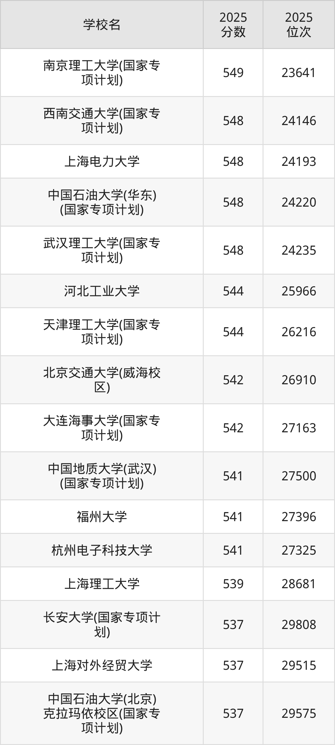 物理类520到550分的大学中分数对应位次最高的是南京理工大学(国家专项计划),2025年最低分549分,对应最低位次是23641名;分数对应位次最低的是北京物资学院,2025年最低分521分,对应最低位次是38389名。