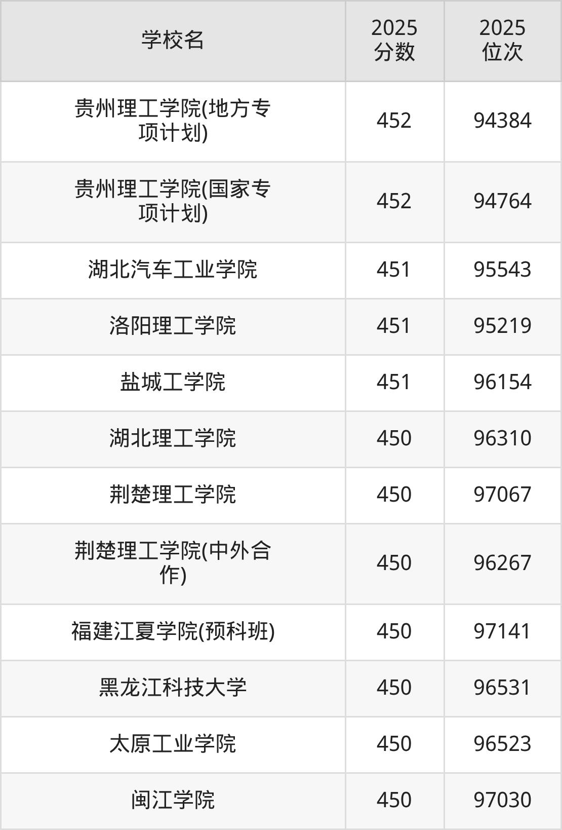 录取分数线的波动较大,下面圆梦小编为大家带来了2025年450到500分对应的位次排名区间,建议2026年位于该位次范围内的考生参考上文所整理的学校(本文仅针对贵州省)。