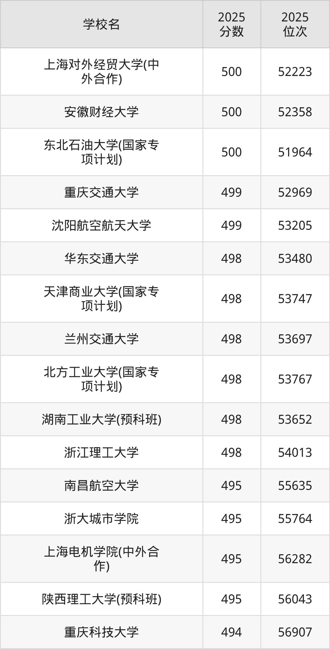 温馨提示:全国各省录取分数线不相同,本文以贵州省为例,为大家带来2025年录取分数线位于450到500分的理科大学名单汇总,并附上该分数段对应的位次排名区间,供查阅。