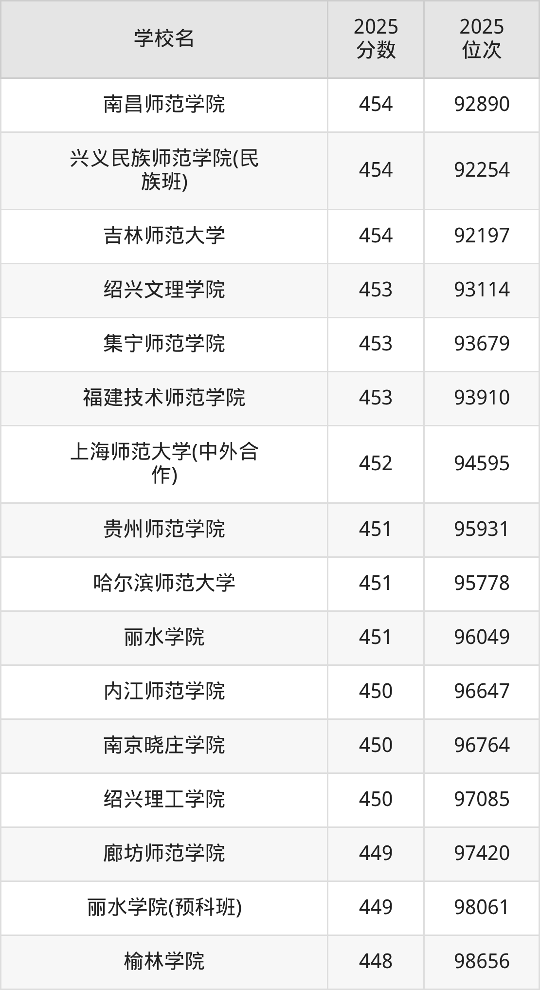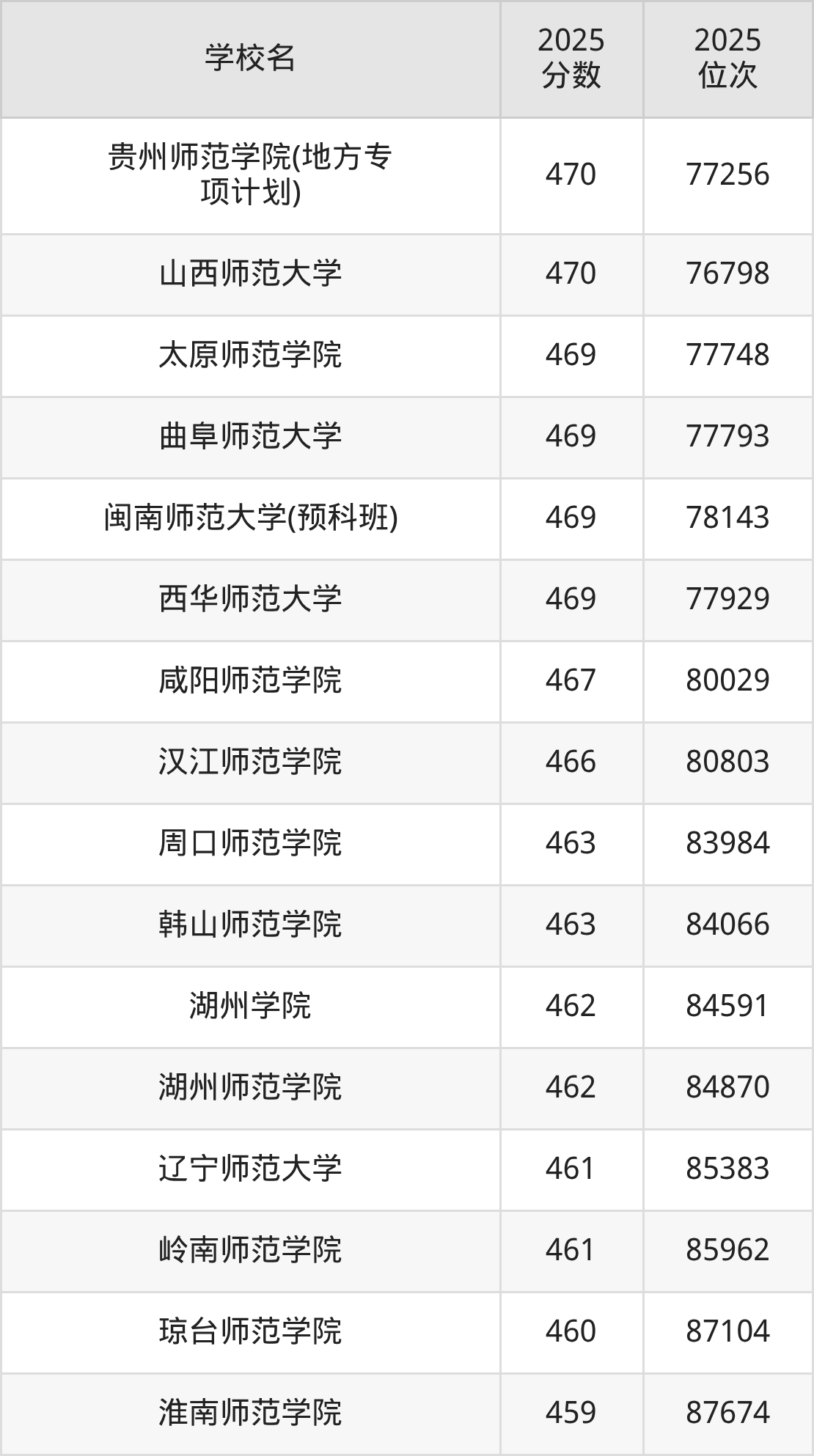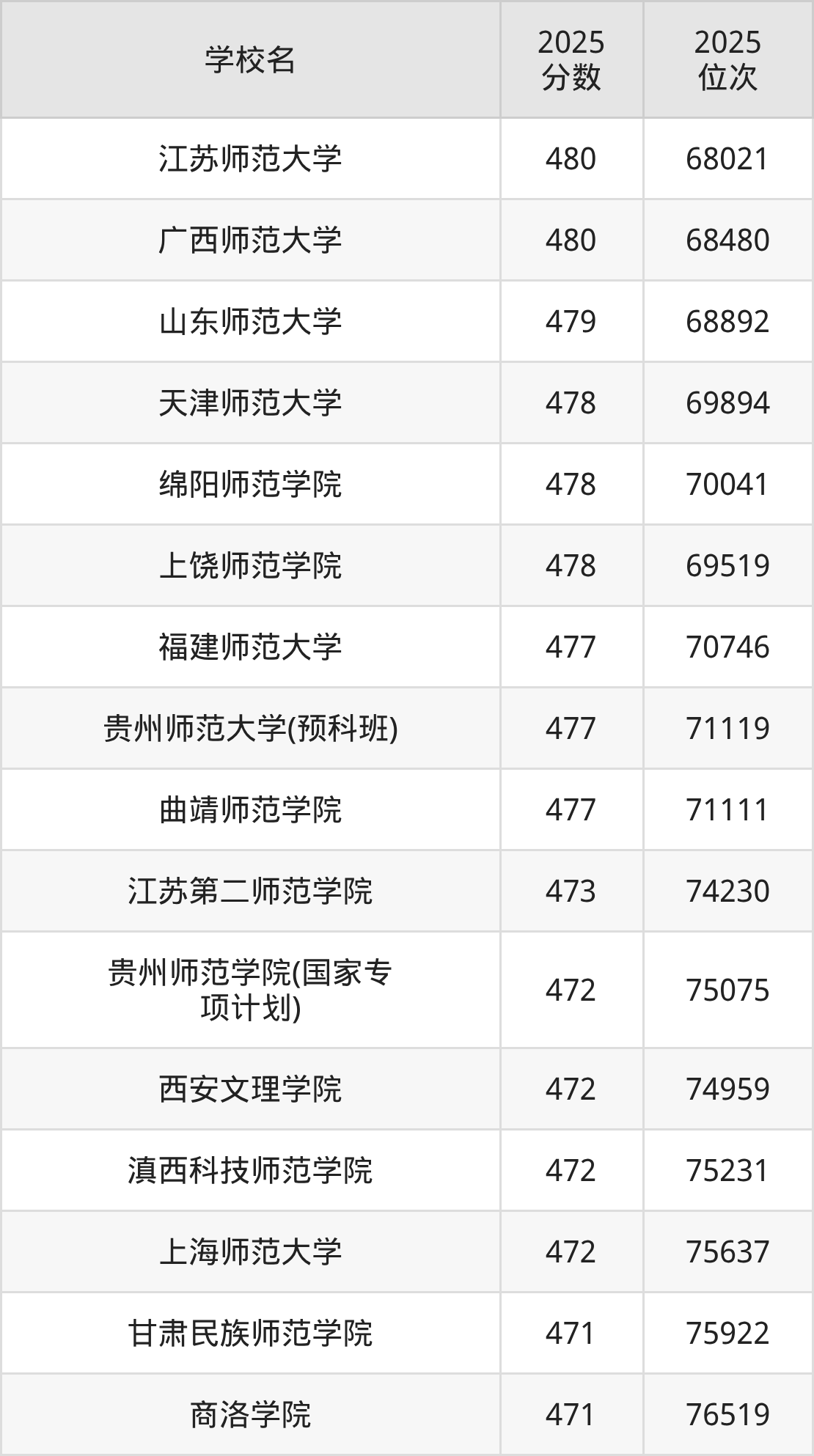 温馨提示:全国各省录取分数线不相同,本文以贵州省为例,为大家带来2025年录取分数线位于430到480分的师范大学名单汇总,并附上该分数段对应的位次排名区间,供查阅。