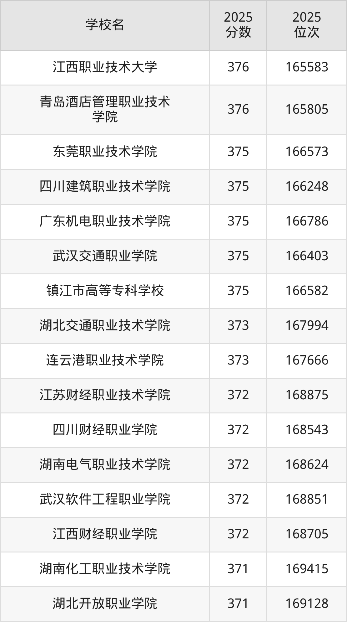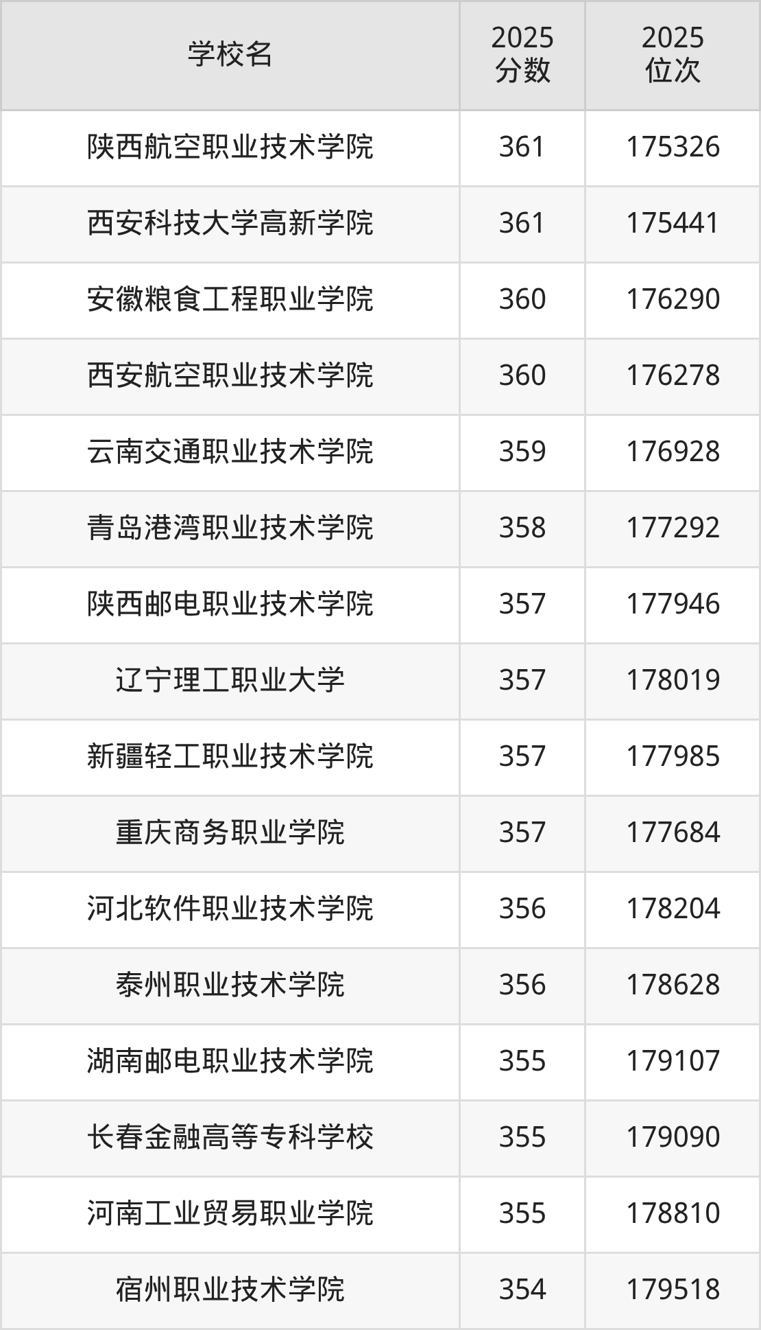| 陕西航空职业技术学院 | 375 | 71955 |