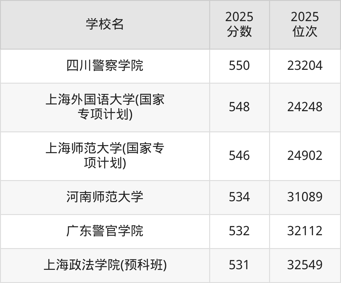 530到580分能上的文科大学有:上海政法学院(预科班)(历史类579分、物理类531分)、北京外国语大学(国家专项计划)(历史类530分、物理类577分)、上海戏剧学院(历史类575分、物理类562分)、广东警官学院、四川警察学院等。
