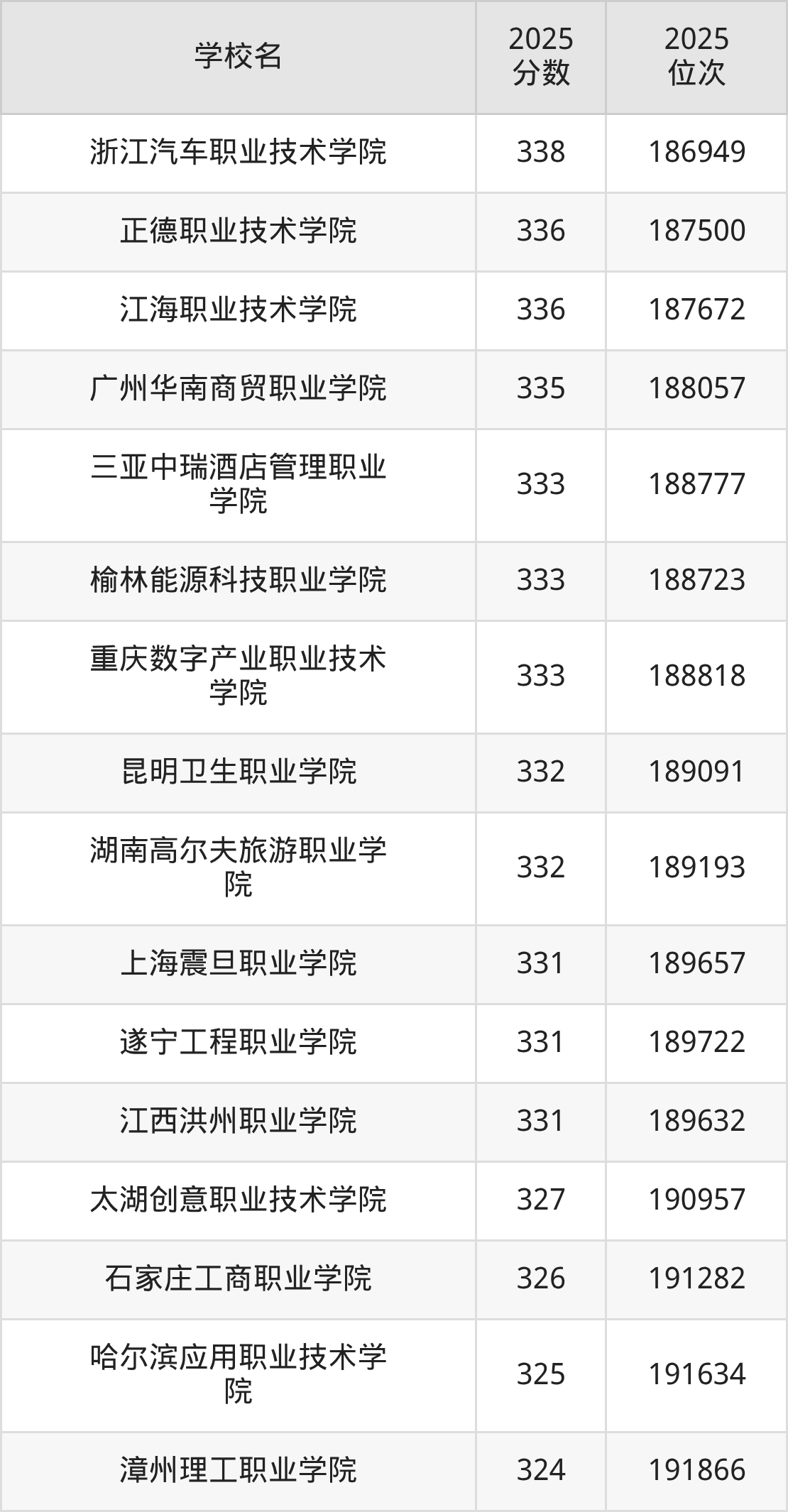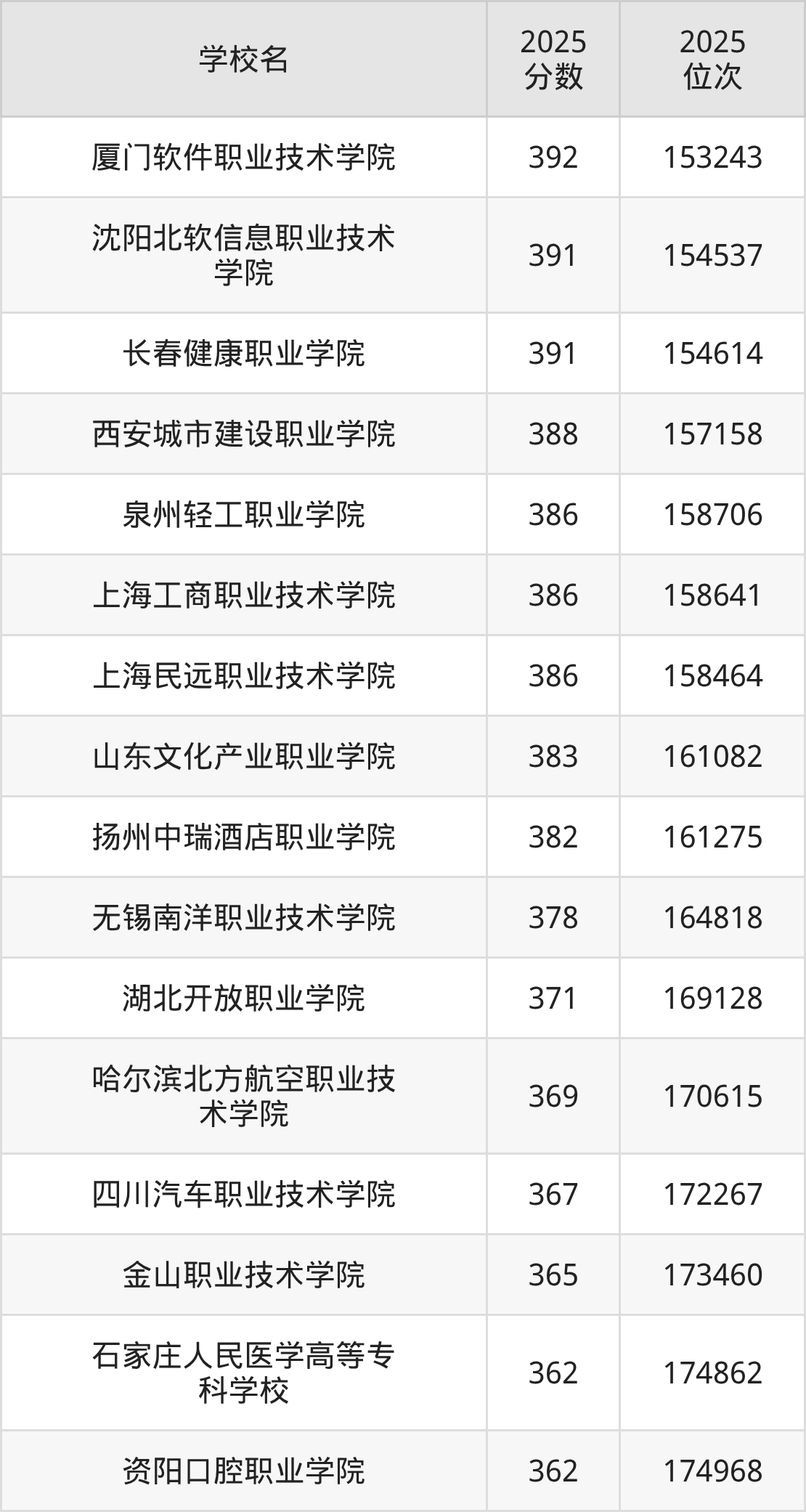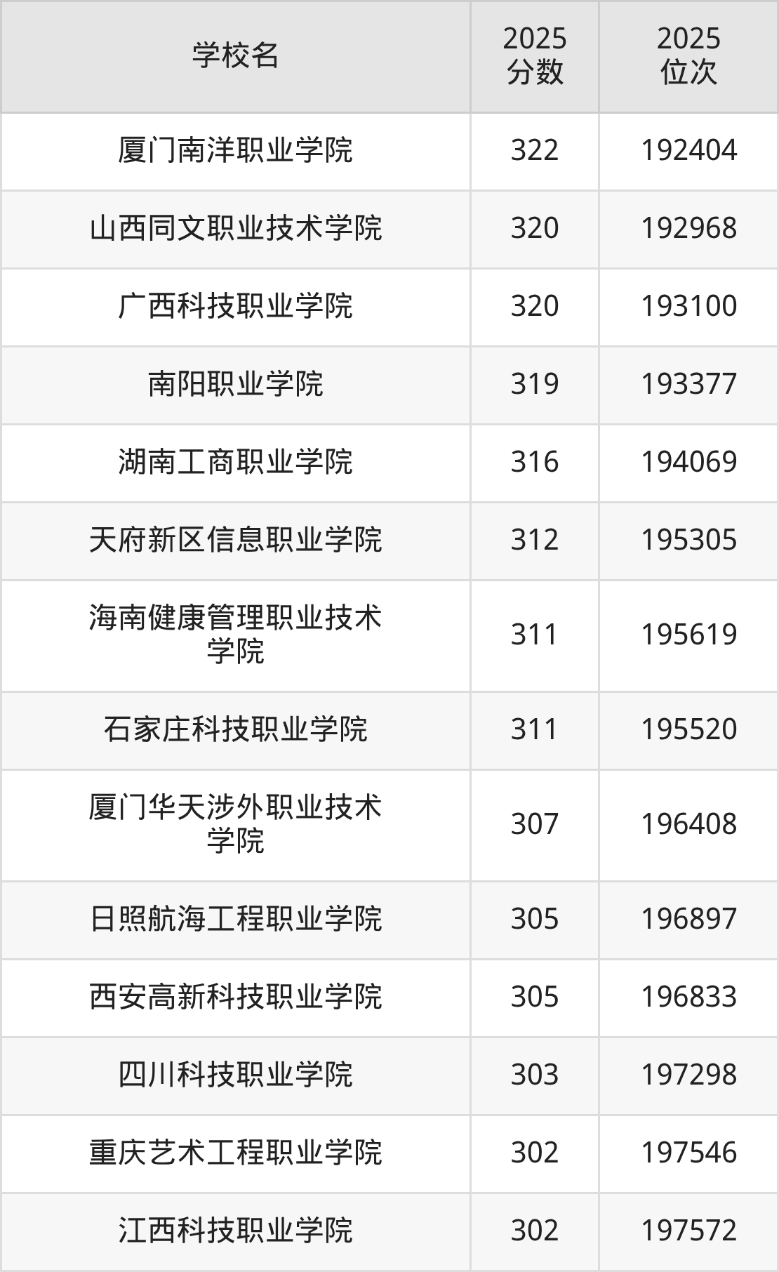 物理类300到400分的大学中分数对应位次最高的是厦门软件职业技术学院,2025年最低分392分,对应最低位次是153243名;分数对应位次最低的是重庆艺术工程职业学院,2025年最低分302分,对应最低位次是197546名。