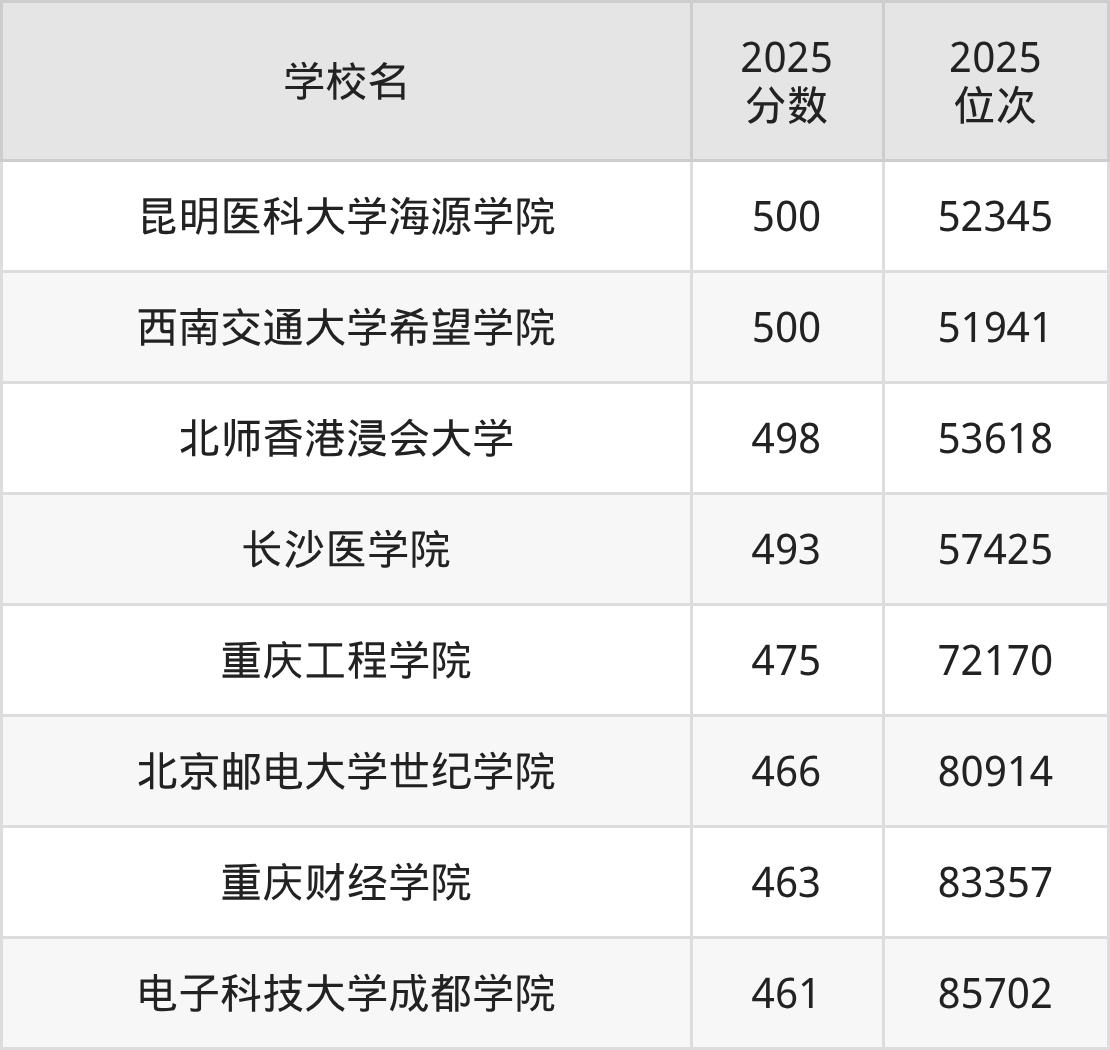 物理类450到500分的大学中分数对应位次最高的是昆明医科大学海源学院,2025年最低分500分,对应最低位次是52345名;分数对应位次最低的是电子科技大学成都学院,2025年最低分461分,对应最低位次是85702名。
