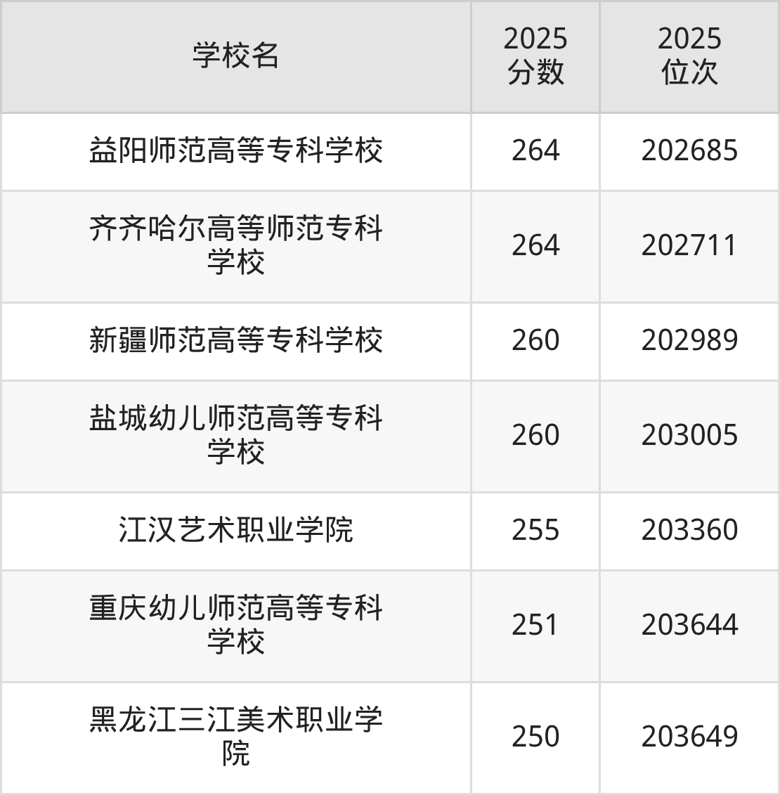 历史类250到300分的大学中分数对应位次最高的是辽宁特殊教育师范高等专科学校,2025年最低分299分,对应最低位次是85799名;分数对应位次最低的是重庆艺术工程职业学院,2025年最低分255分,对应最低位次是87773名。
