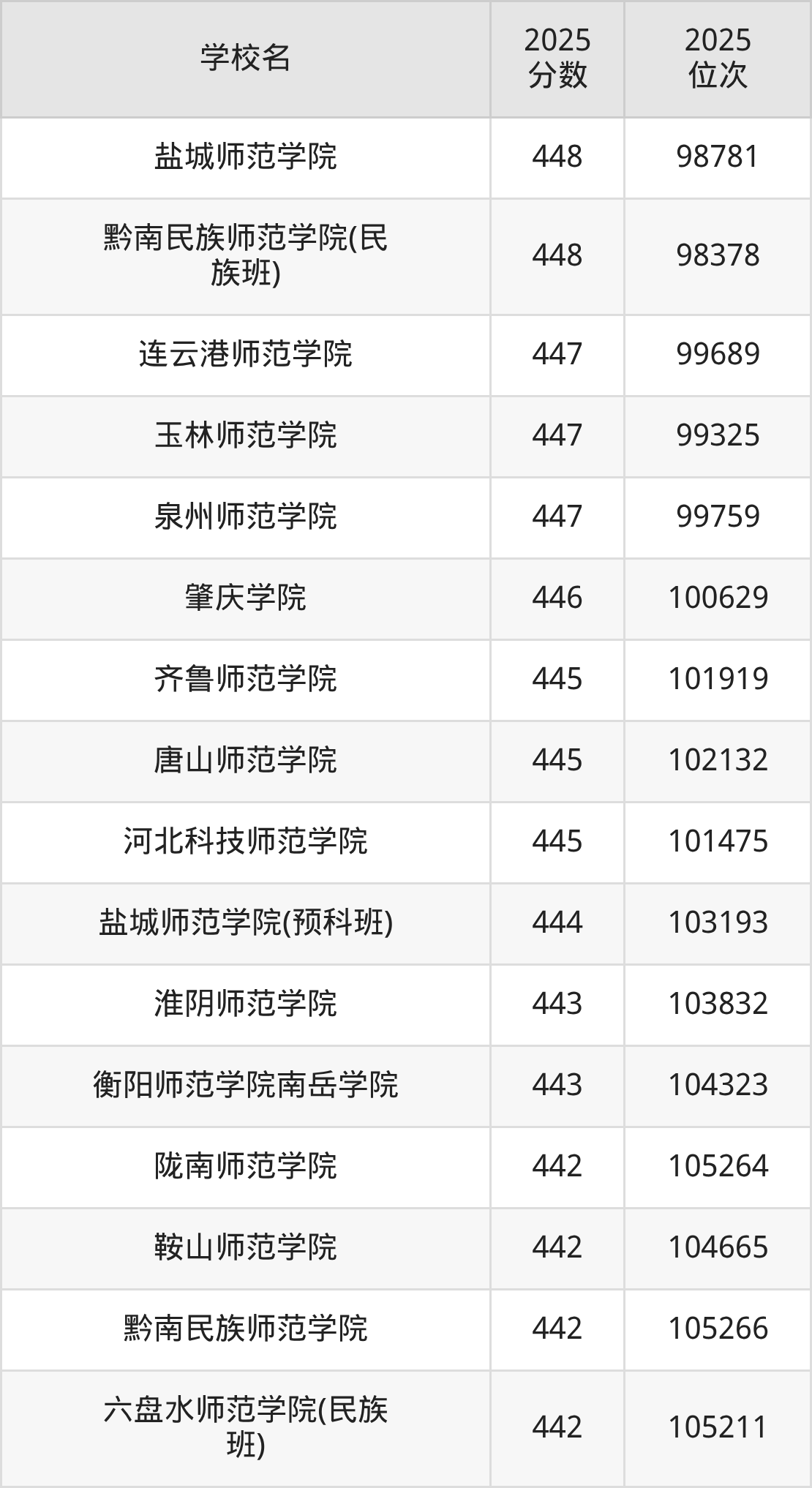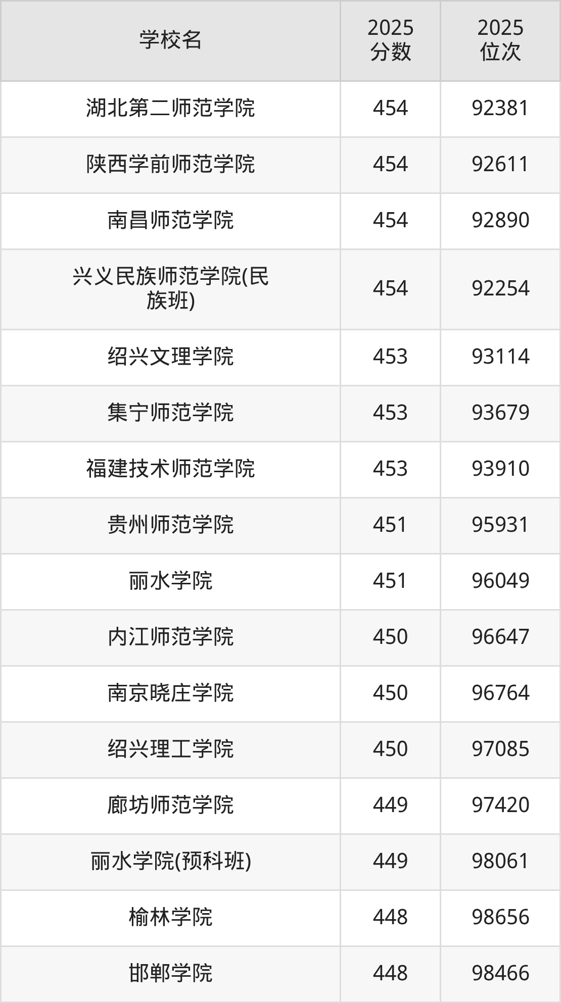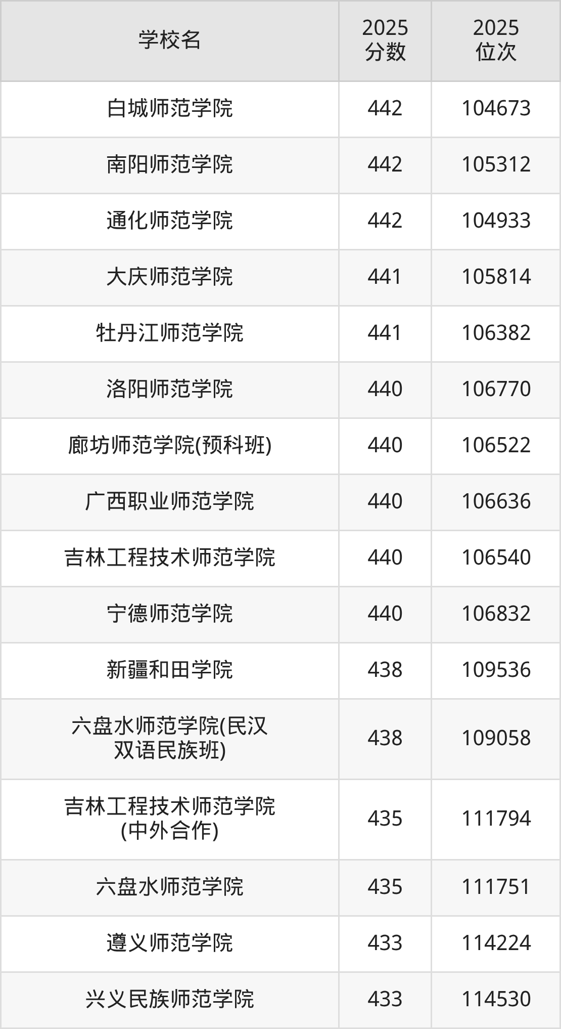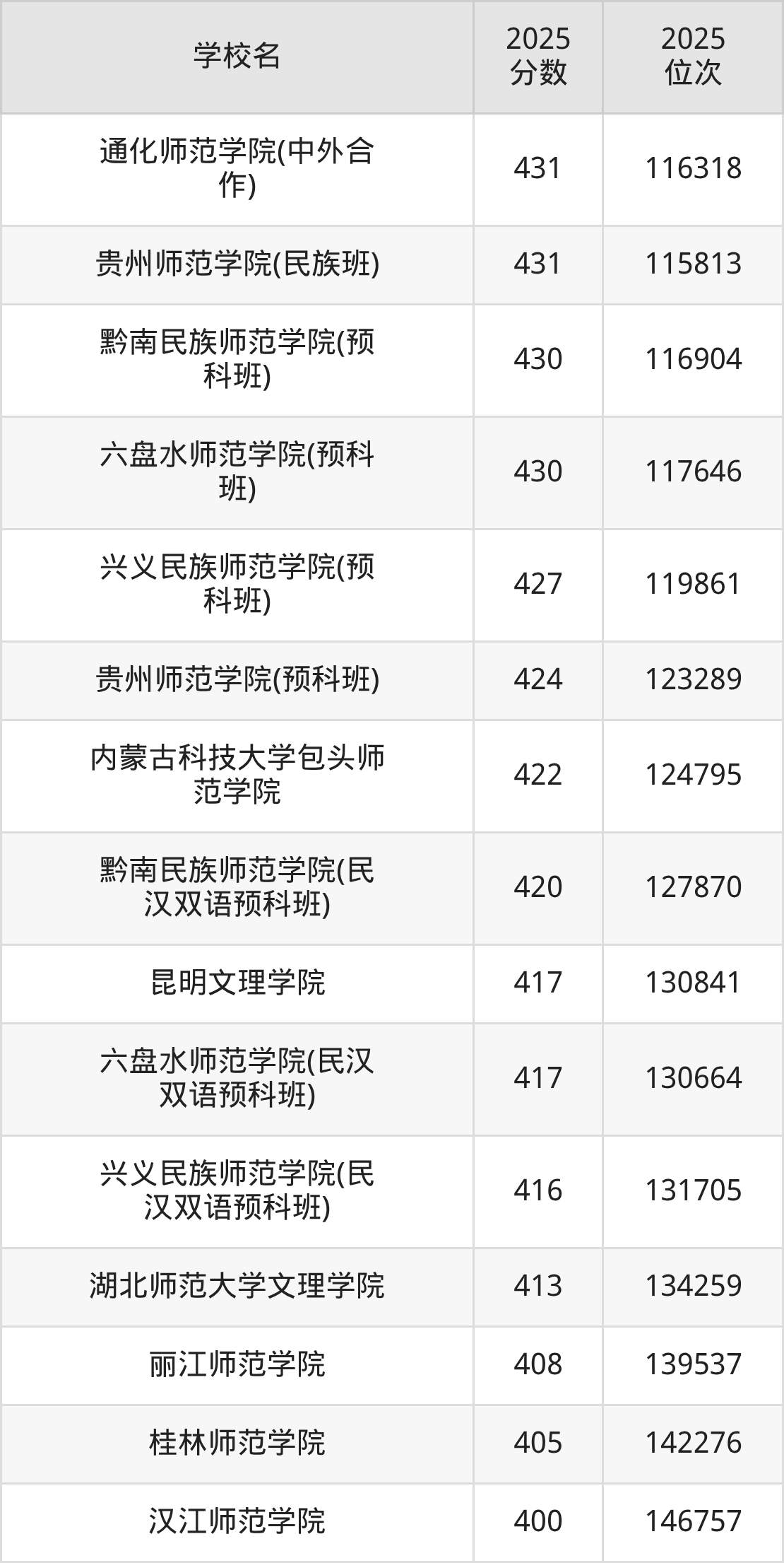 温馨提示:全国各省录取分数线不相同,本文以贵州省为例,为大家带来2025年录取分数线位于400到500分的二本师范大学名单汇总,并附上该分数段对应的位次排名区间,供查阅。