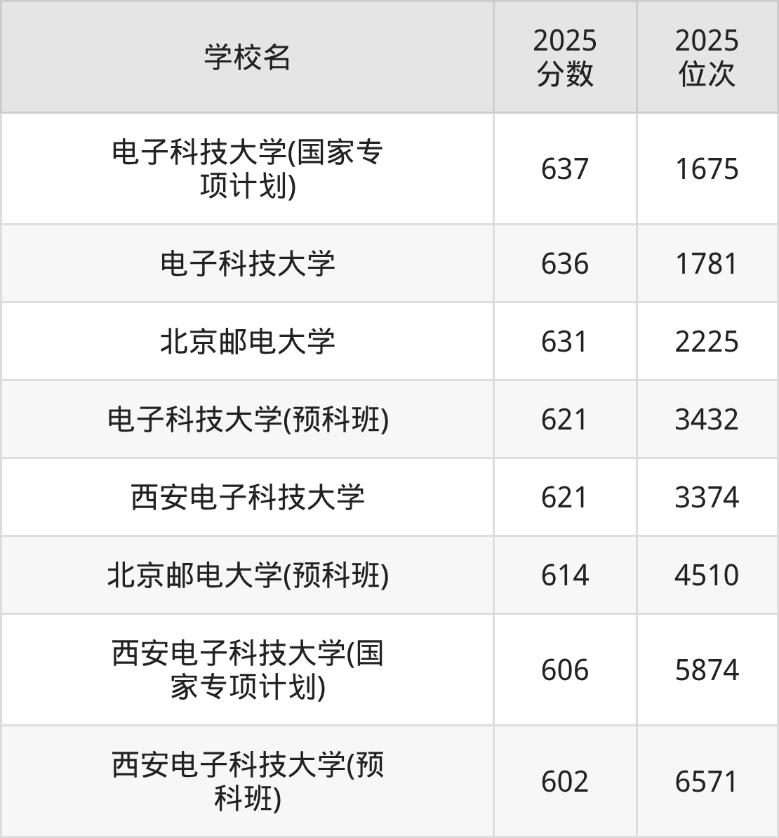 物理类600到650分的大学中分数对应位次最高的是电子科技大学(国家专项计划),2025年最低分637分,对应最低位次是1675名;分数对应位次最低的是西安电子科技大学(预科班),2025年最低分602分,对应最低位次是6571名。
