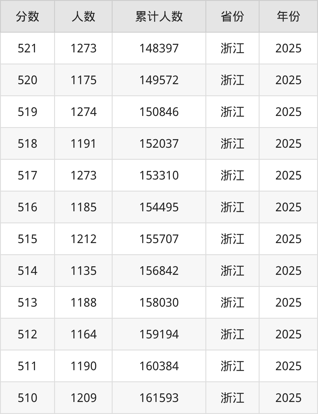温馨提示:全国各省录取分数线不相同,本文以浙江省为例,为大家带来2025年录取分数线位于510到520分的铁路学校名单汇总,并附上该分数段对应的位次排名区间,供查阅。