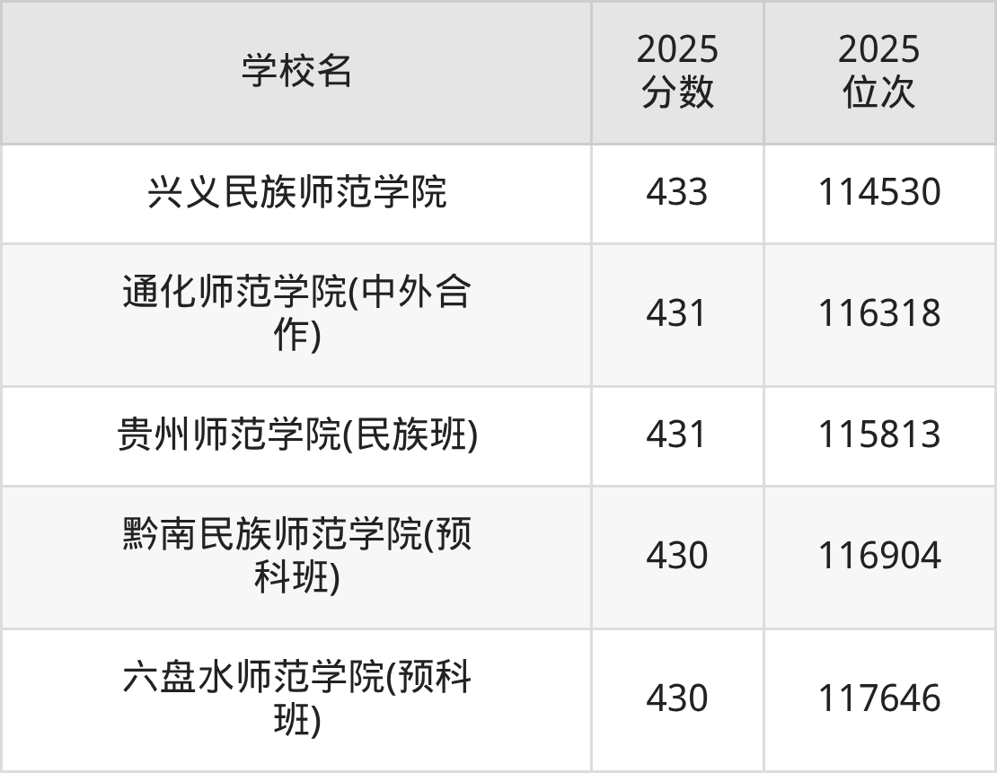 温馨提示:全国各省录取分数线不相同,本文以贵州省为例,为大家带来2025年录取分数线位于430到450分的师范大学名单汇总,并附上该分数段对应的位次排名区间,供查阅。