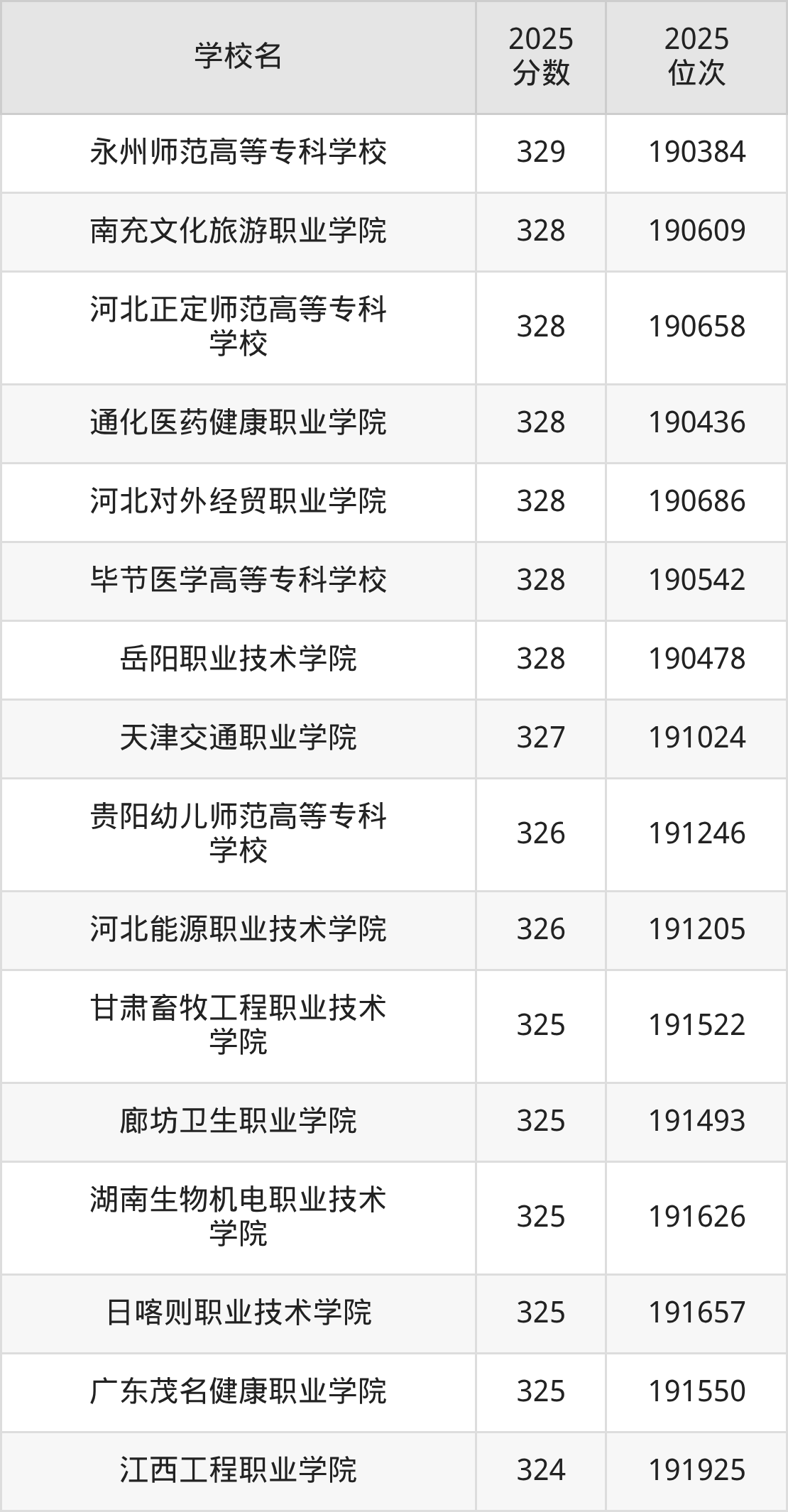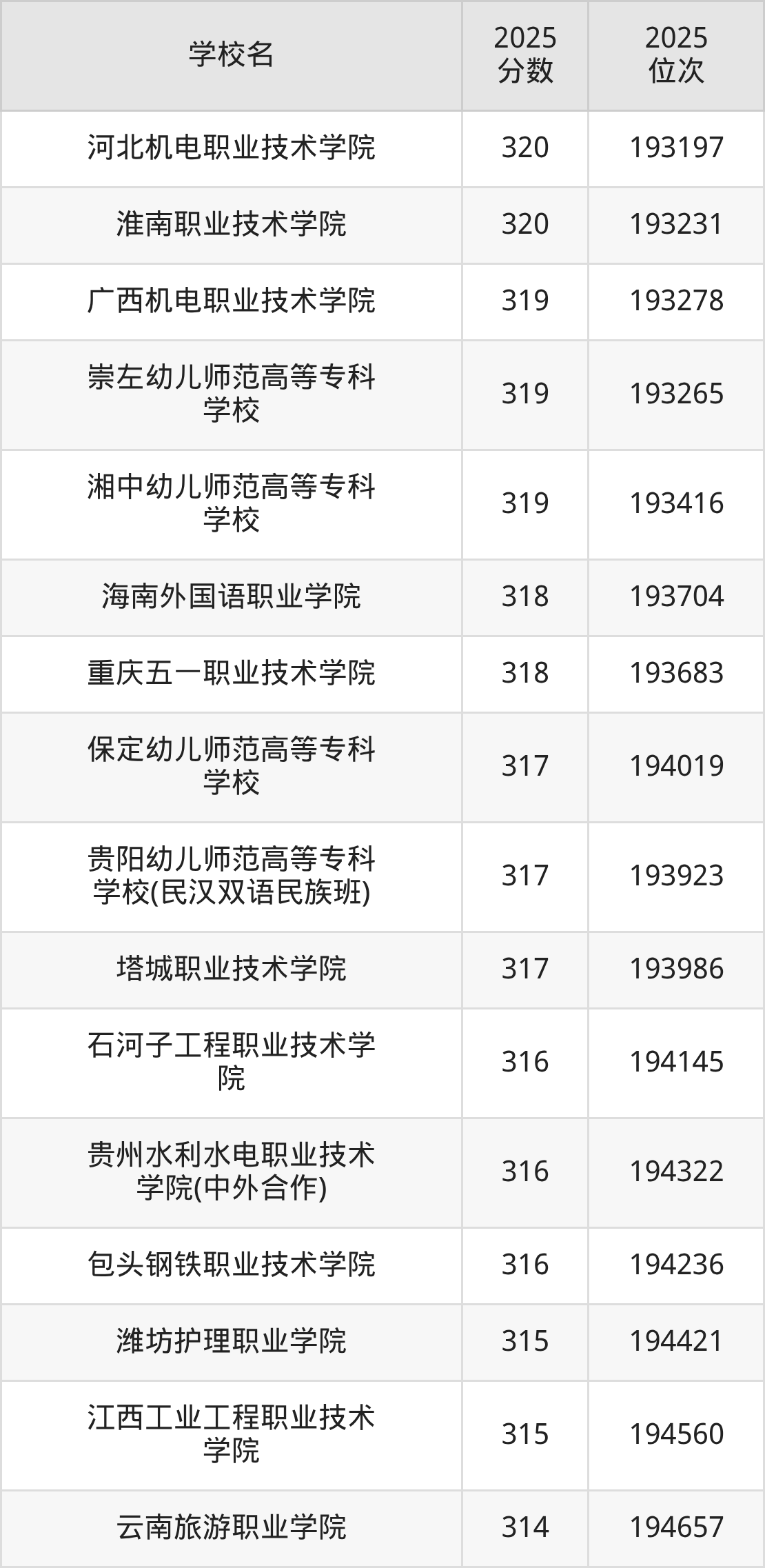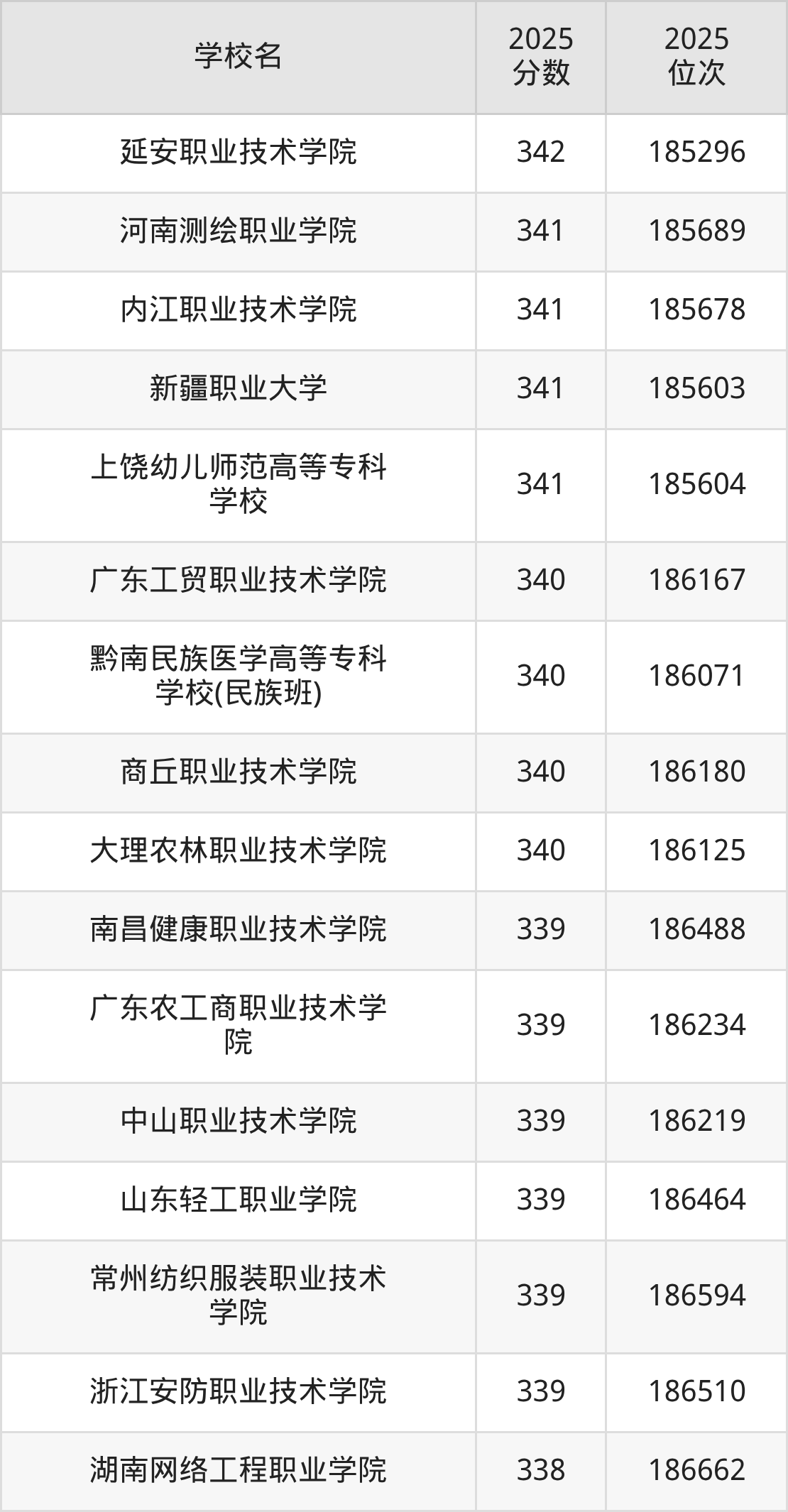 温馨提示:全国各省录取分数线不相同,本文以贵州省为例,为大家带来2025年录取分数线位于300到400分的公办专科学校名单汇总,并附上该分数段对应的位次排名区间,供查阅。