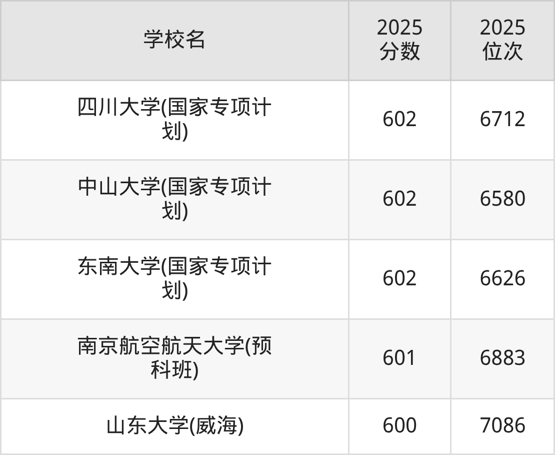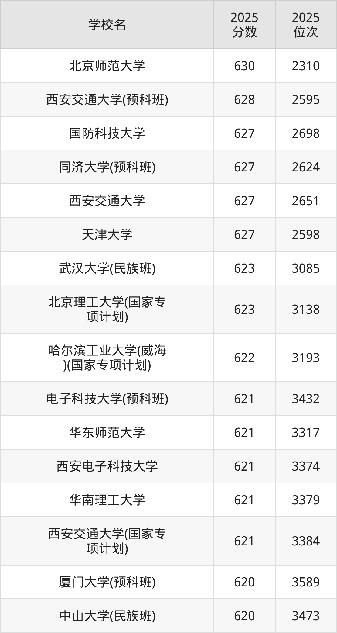 物理类600到630分的大学中分数对应位次最高的是北京师范大学,2025年最低分630分,对应最低位次是2310名;分数对应位次最低的是山东大学(威海),2025年最低分600分,对应最低位次是7086名。