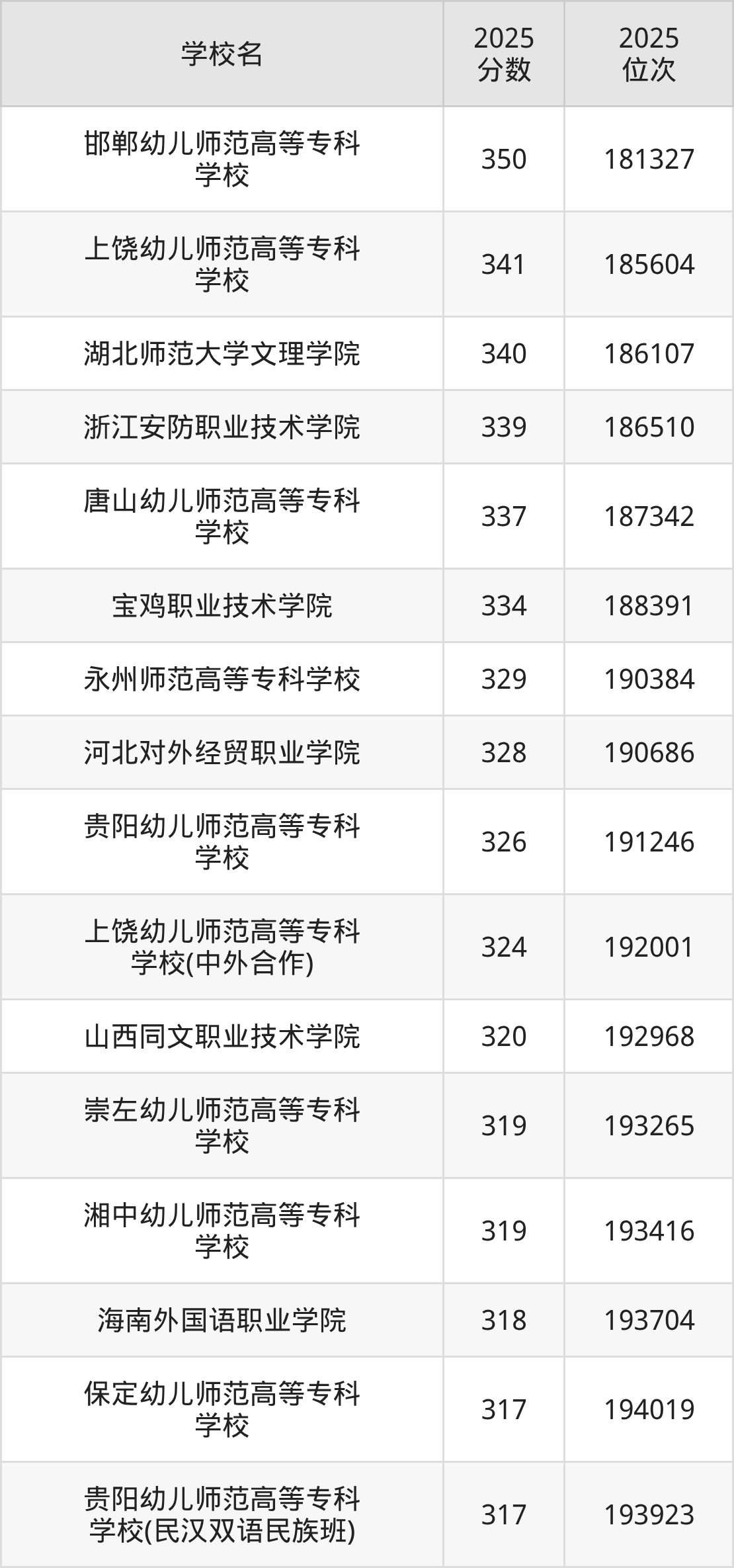 物理类300到350分的大学中分数对应位次最高的是邯郸幼儿师范高等专科学校,2025年最低分350分,对应最低位次是181327名;分数对应位次最低的是铁岭师范高等专科学校,2025年最低分301分,对应最低位次是197607名。