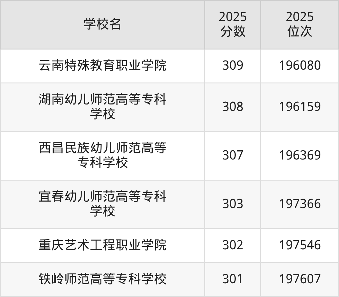 | 西昌民族幼儿师范高等 专科学校 | 307 | 85021 |
