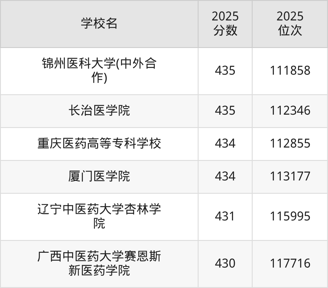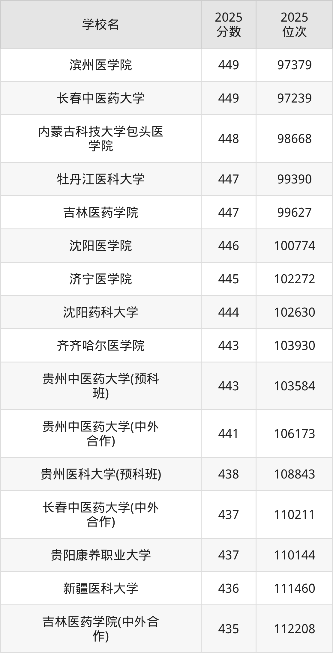 温馨提示:全国各省录取分数线不相同,本文以贵州省为例,为大家带来2025年录取分数线位于430到450分的医科大学名单汇总,并附上该分数段对应的位次排名区间,供查阅。