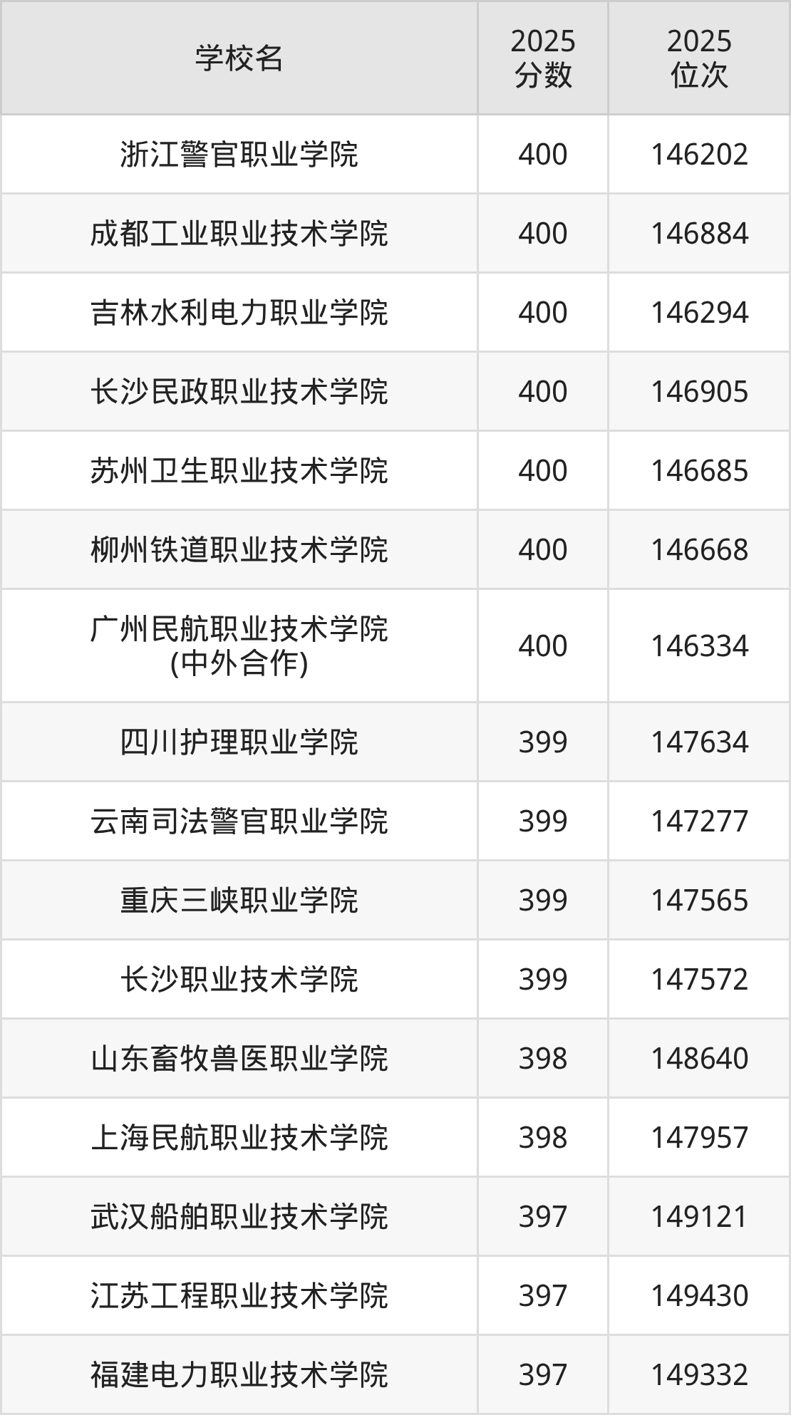 物理类380到400分的大学中分数对应位次最高的是浙江警官职业学院,2025年最低分400分,对应最低位次是146202名;分数对应位次最低的是新疆铁道职业技术学院,2025年最低分380分,对应最低位次是162682名。