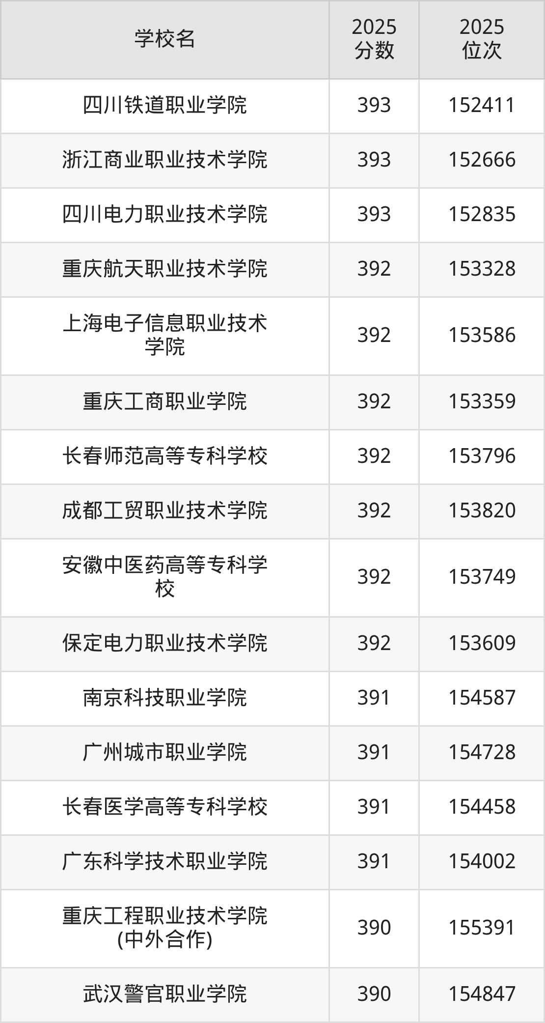 温馨提示:全国各省录取分数线不相同,本文以贵州省为例,为大家带来2025年录取分数线位于380到400分的公办专科学校名单汇总,并附上该分数段对应的位次排名区间,供查阅。
