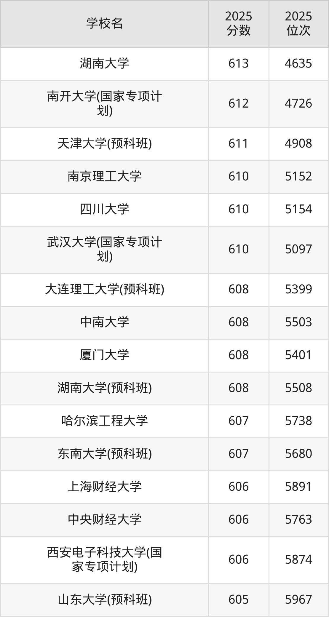 | 湖南大学(预科班) | 614 | 1304 |