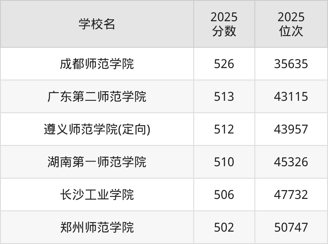 物理类500到540分的大学中分数对应位次最高的是成都师范学院,2025年最低分526分,对应最低位次是35635名;分数对应位次最低的是郑州师范学院,2025年最低分502分,对应最低位次是50747名。