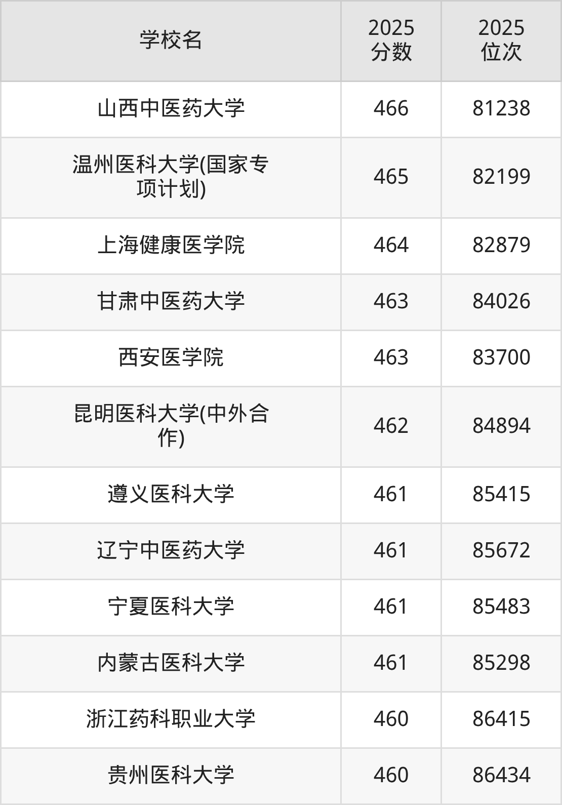 温馨提示:全国各省录取分数线不相同,本文以贵州省为例,为大家带来2025年录取分数线位于460到480分的医科大学名单汇总,并附上该分数段对应的位次排名区间,供查阅。