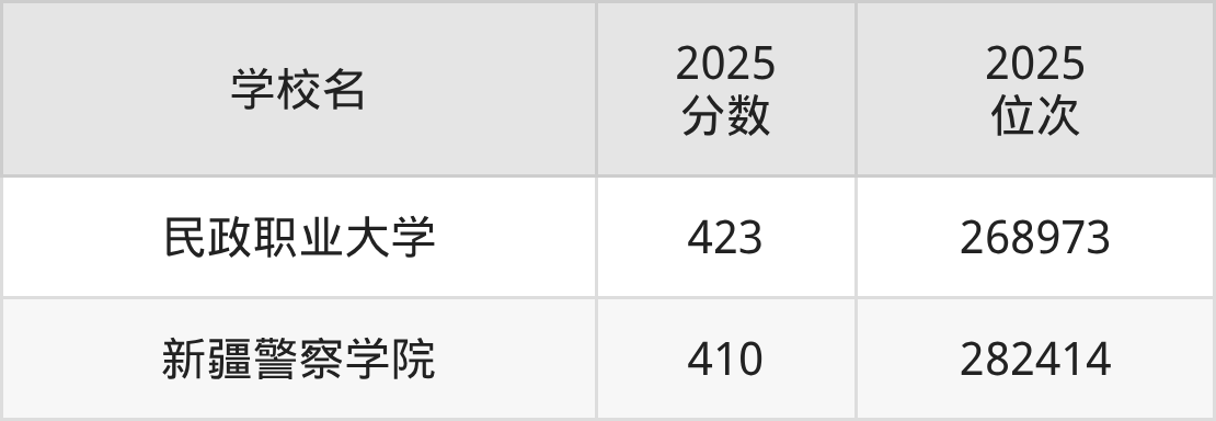 物理类410到430分的大学中分数对应位次最高的是民政职业大学,2025年最低分423分,对应最低位次是268973名;分数对应位次最低的是新疆警察学院,2025年最低分410分,对应最低位次是282414名。