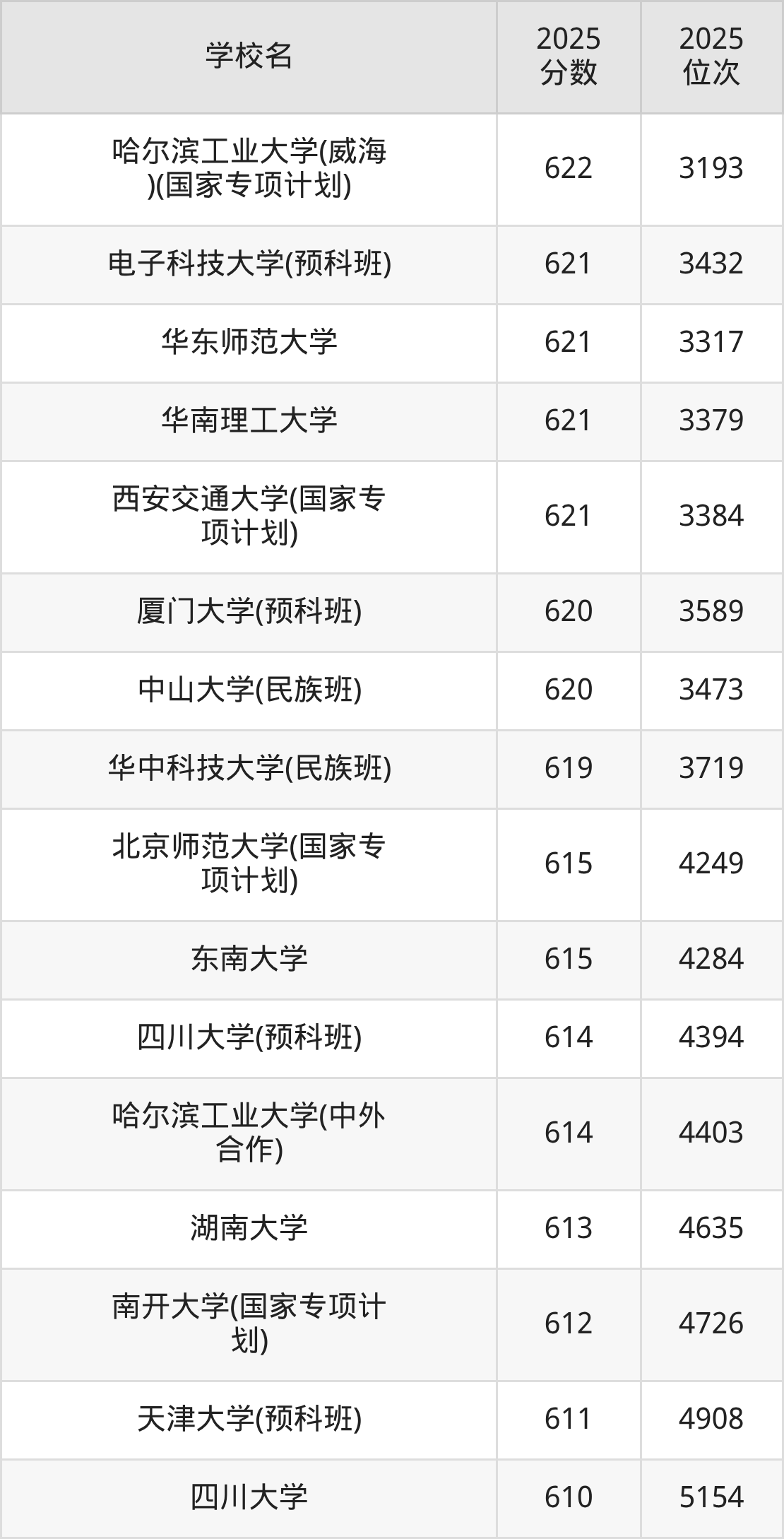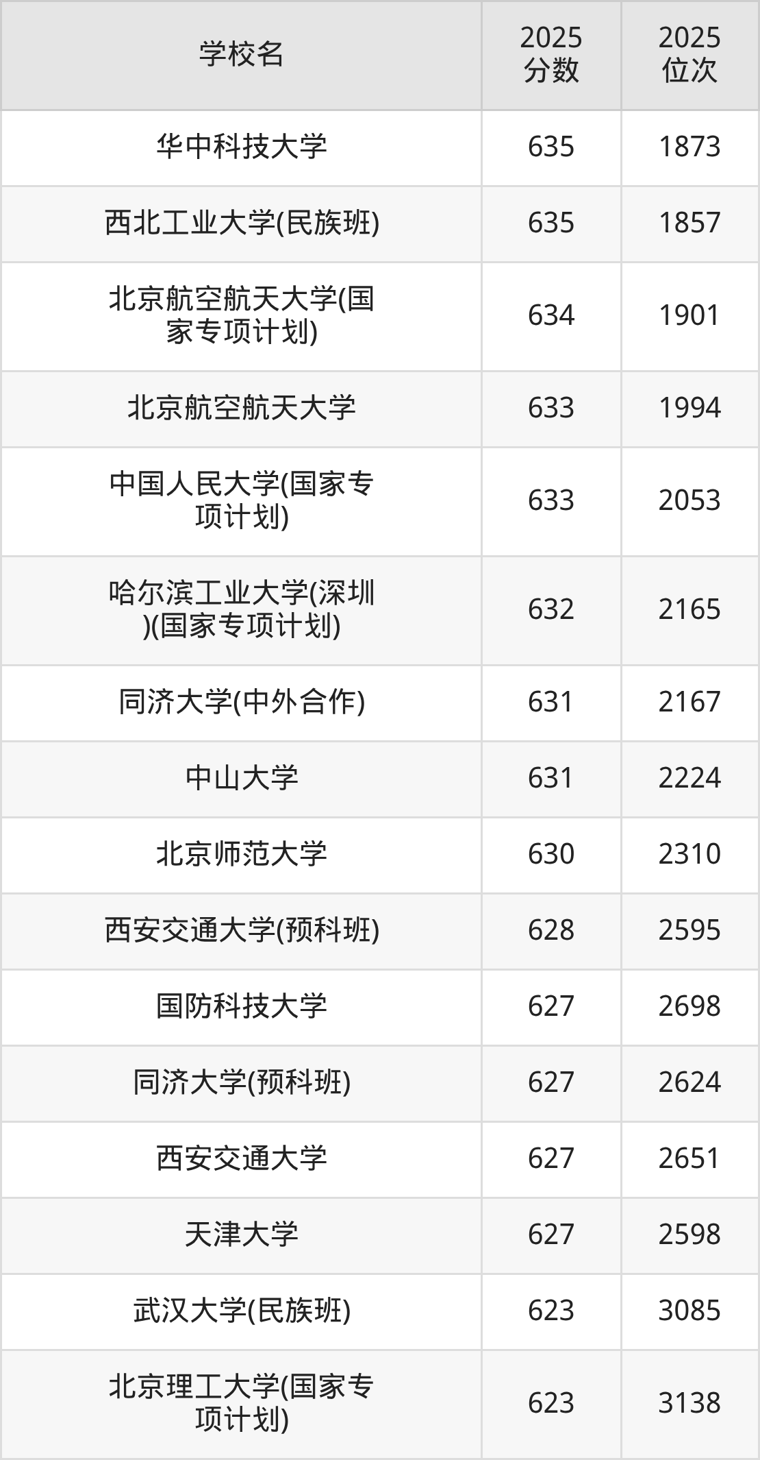 温馨提示:全国各省录取分数线不相同,本文以贵州省为例,为大家带来2025年录取分数线位于600到650分的985大学名单汇总,并附上该分数段对应的位次排名区间,供查阅。