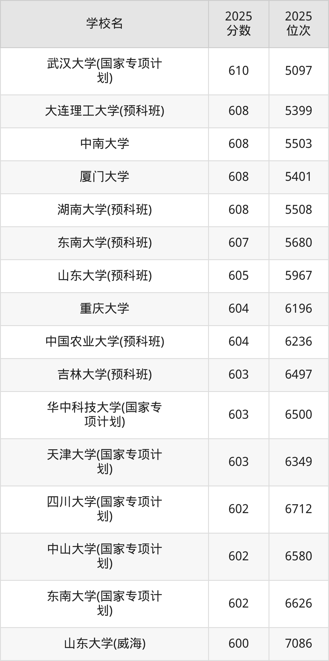 物理类600到650分的大学中分数对应位次最高的是复旦大学(国家专项计划),2025年最低分650分,对应最低位次是833名;分数对应位次最低的是山东大学(威海),2025年最低分600分,对应最低位次是7086名。