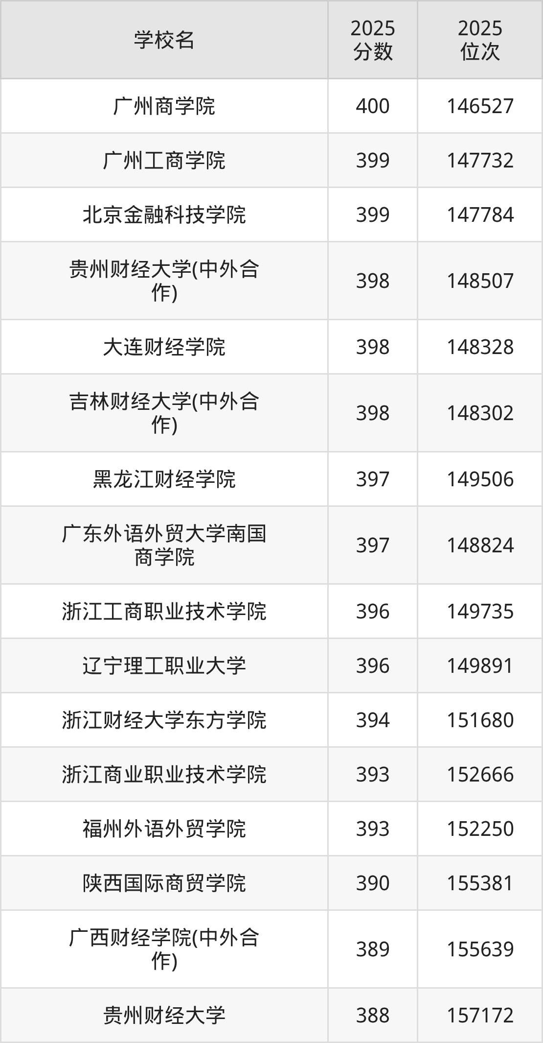 温馨提示:全国各省录取分数线不相同,本文以贵州省为例,为大家带来2025年录取分数线位于300到400分的财经大学名单汇总,并附上该分数段对应的位次排名区间,供查阅。