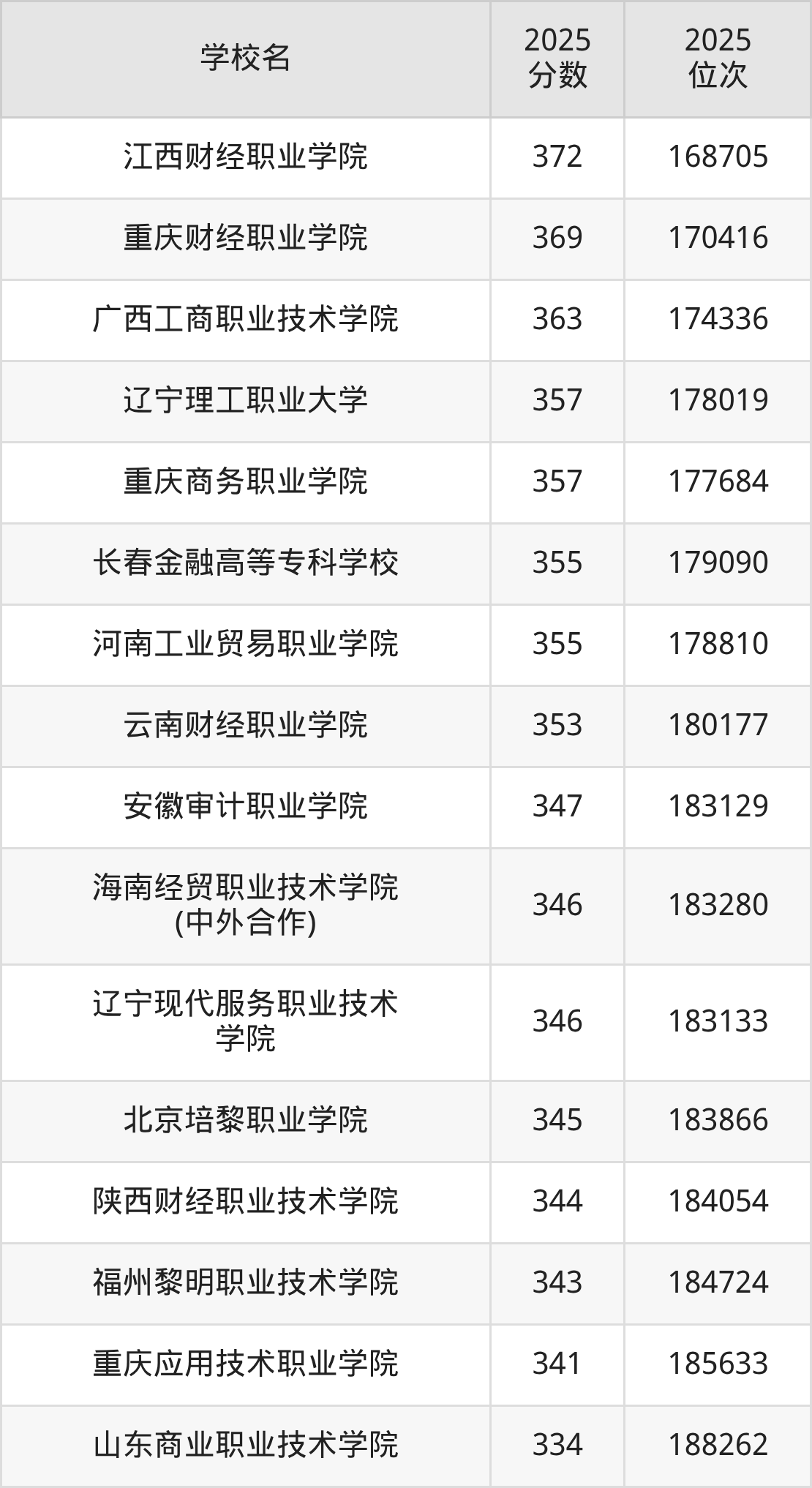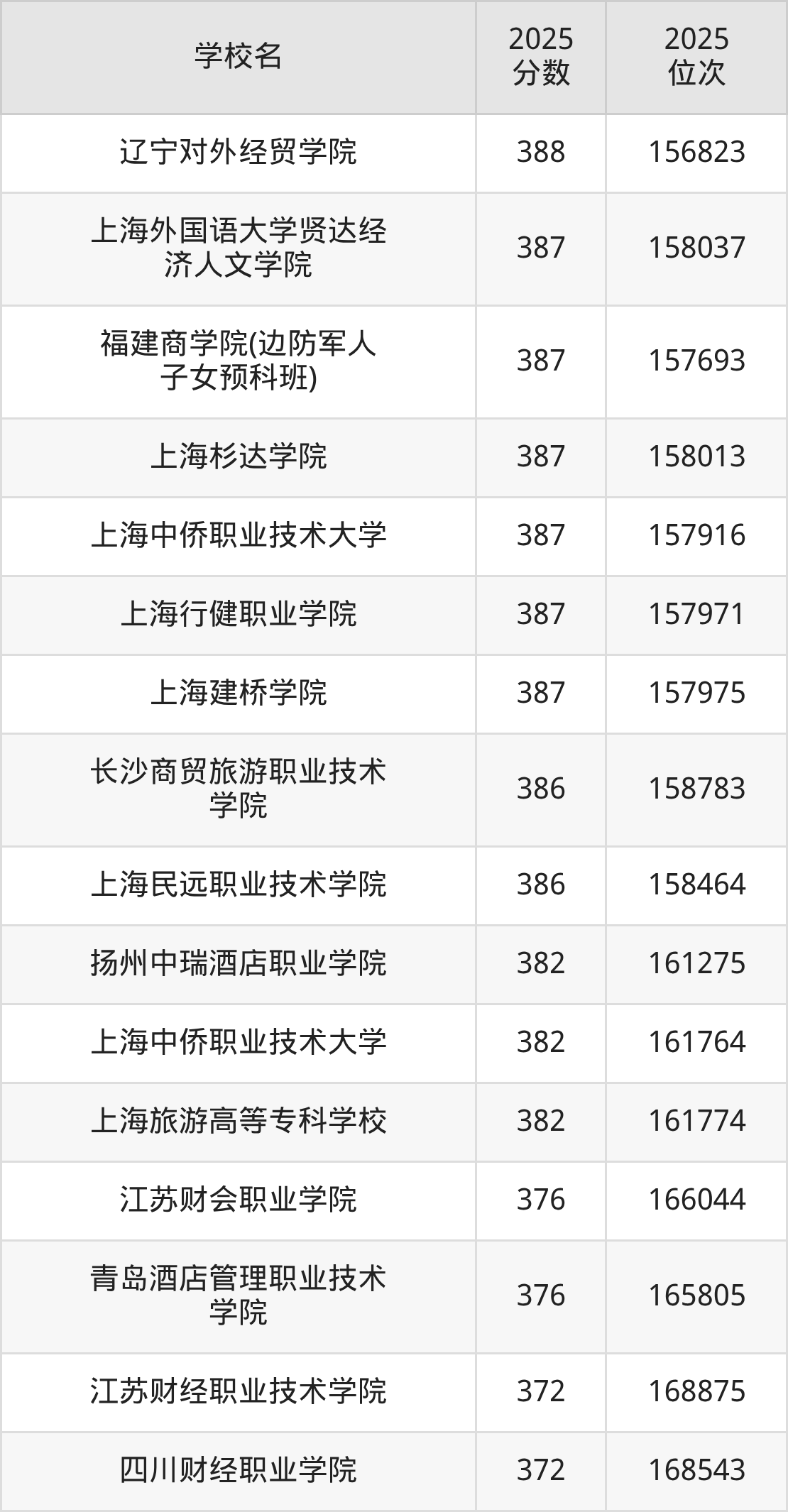 | 长春金融高等专科学校 | 390 | 67138 |