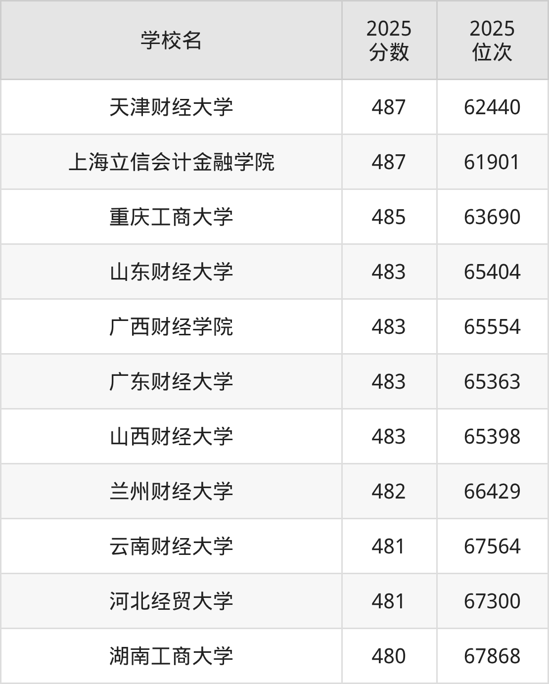 温馨提示:全国各省录取分数线不相同,本文以贵州省为例,为大家带来2025年录取分数线位于480到490分的财经大学名单汇总,并附上该分数段对应的位次排名区间,供查阅。
