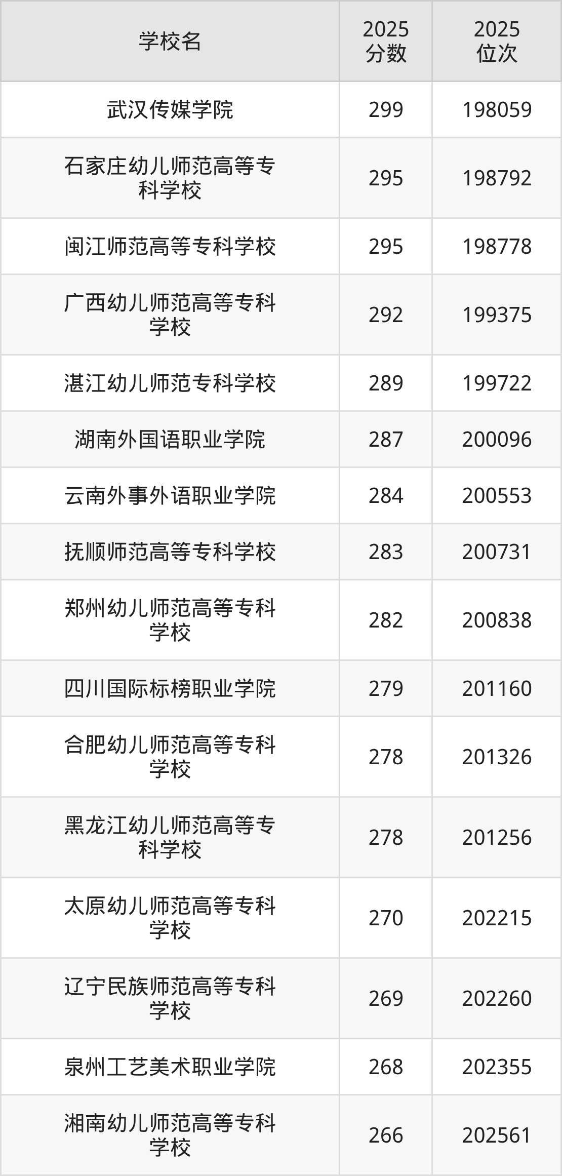 物理类260到300分的大学中分数对应位次最高的是武汉传媒学院,2025年最低分299分,对应最低位次是198059名;分数对应位次最低的是新疆师范高等专科学校,2025年最低分260分,对应最低位次是202989名。