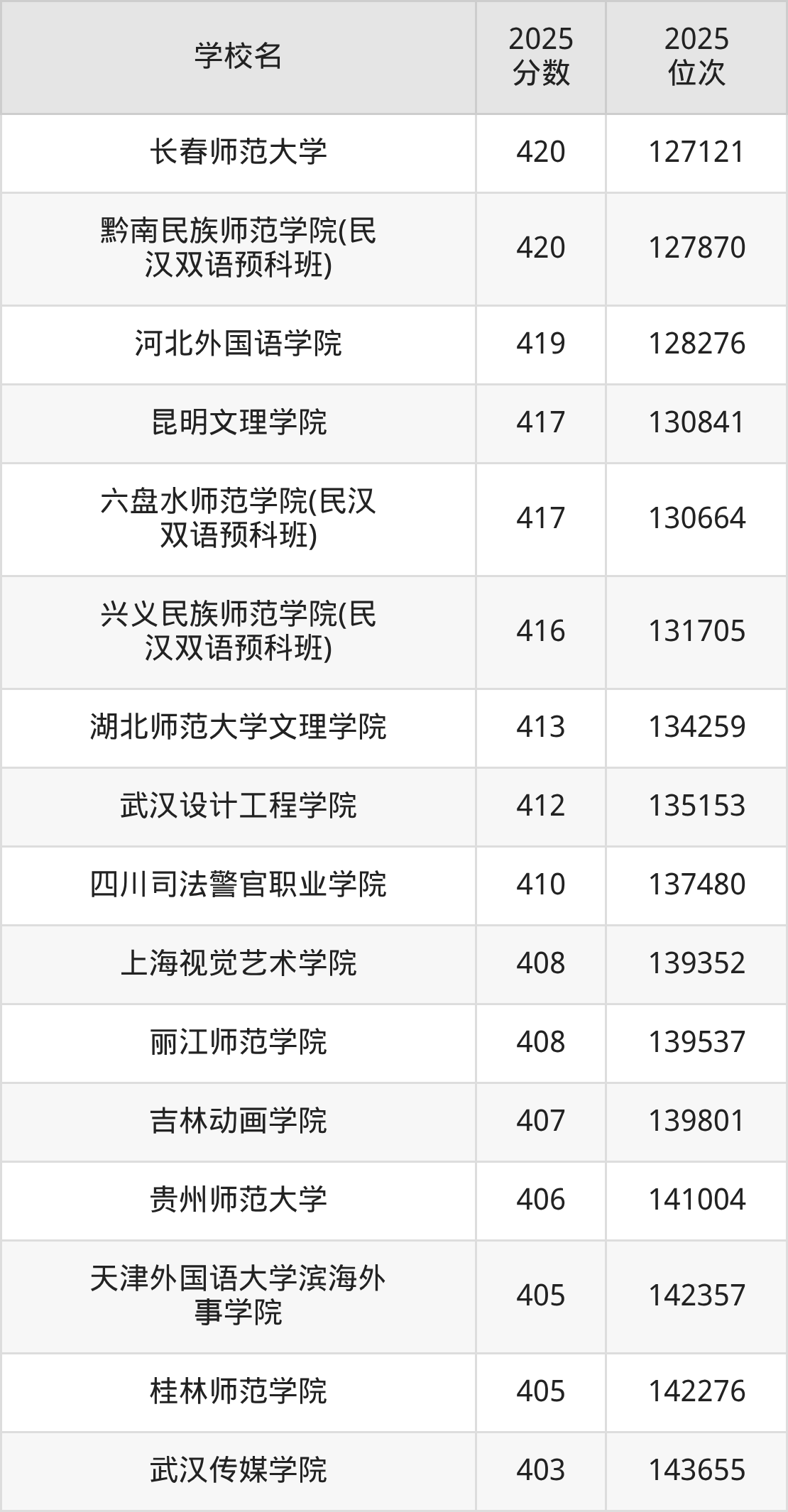 温馨提示:全国各省录取分数线不相同,本文以贵州省为例,为大家带来2025年录取分数线位于400到450分的文科大学名单汇总,并附上该分数段对应的位次排名区间,供查阅。