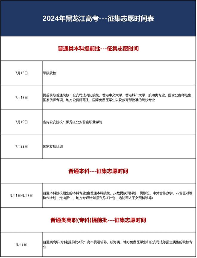 根据各省教育考试院公布的《2024年普通高校招生录取时间》的相关通知,2024年各批次征集志愿时间安排如下: