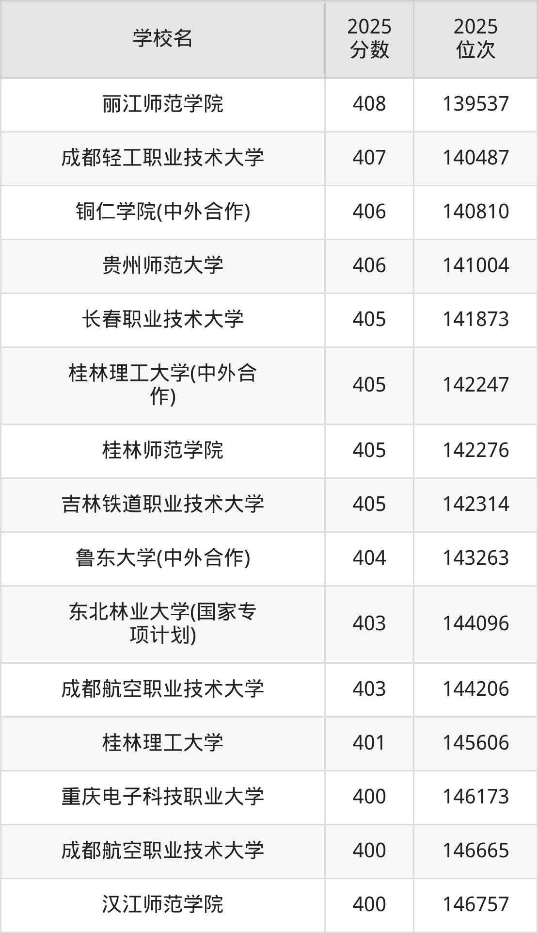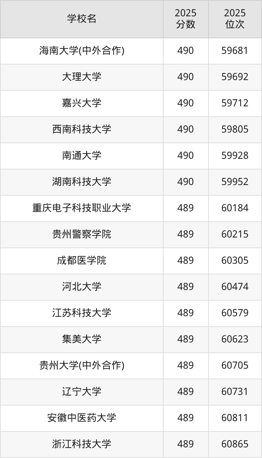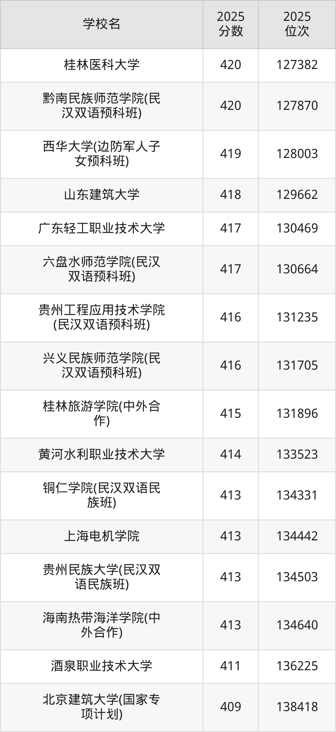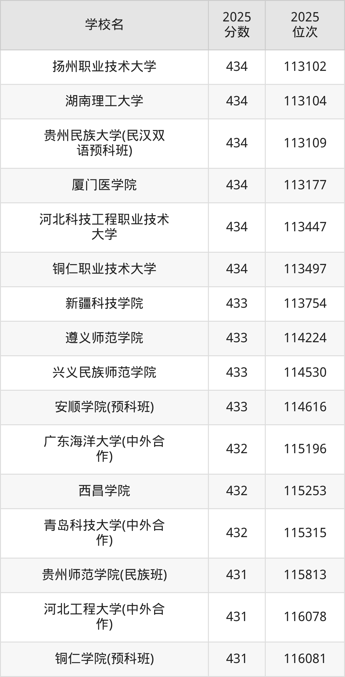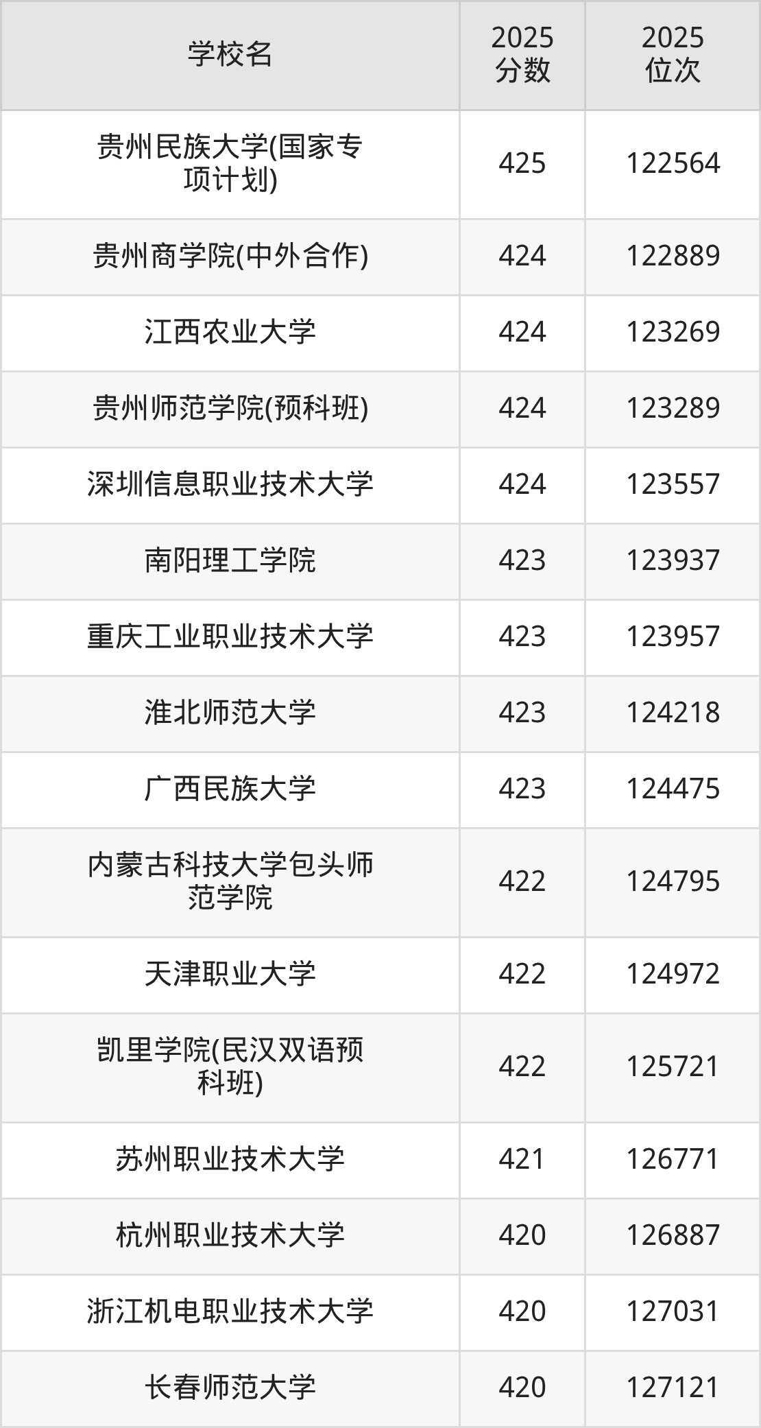 鉴于录取分数线存在一定波动,本文特此整理2025年高考400到500分数段所对应的位次排名区间,供2026年高考成绩处于该位次范围内的考生参考上文所列院校信息。需说明的是,本文内容仅适用于贵州省高考。