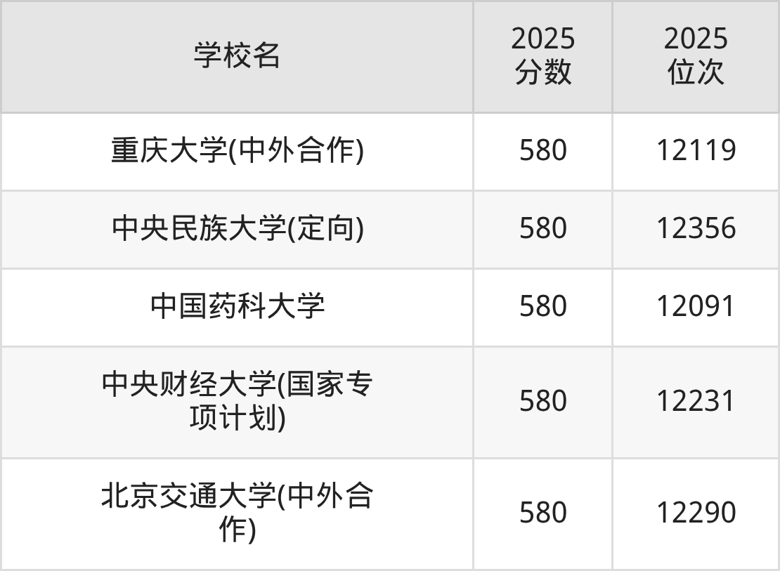 历史类580到600分的大学中分数对应位次最高的是华东政法大学(国家专项计划),2025年最低分600分,对应最低位次是2200名;分数对应位次最低的是广州大学,2025年最低分580分,对应最低位次是4062名。