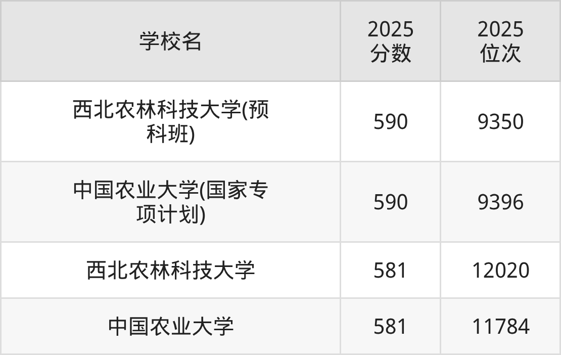 物理类580到600分的大学中分数对应位次最高的是西北农林科技大学(预科班),2025年最低分590分,对应最低位次是9350名;分数对应位次最低的是西北农林科技大学,2025年最低分581分,对应最低位次是12020名。